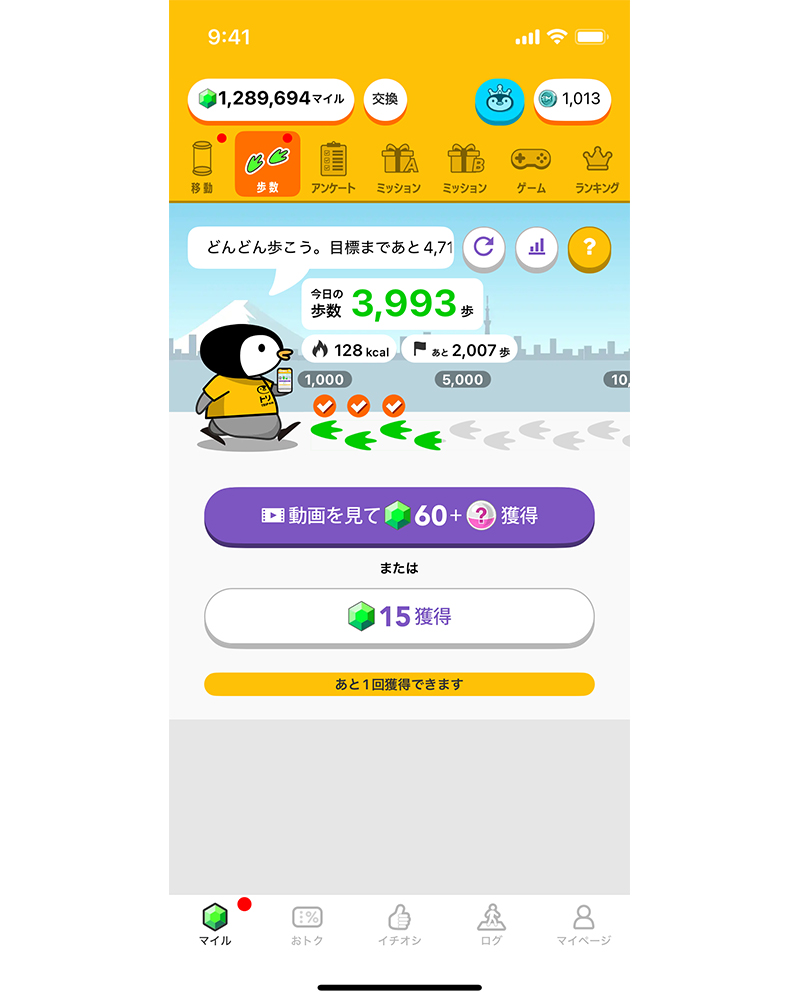 また、アンケート回答やミッションなど、移動以外の貯め方も用意されており、無理なく続けやすいのもポイント。AppleヘルスケアやGoogle Fitとも連携し、歩数や消費カロリーを自動で記録できるため、ウォーキングの運動量を把握しながら、生活に役立つポイントを貯められます。
