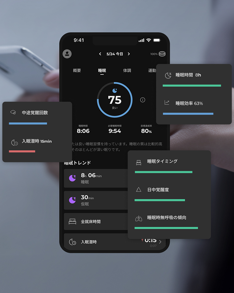 また、本機には独自開発の光電容積脈波(PPG)センサー「Deep Sensing」を搭載し、心拍数や血中酸素レベル、皮膚温といったバイタルデータを高精度に測定。特に睡眠に関しては、睡眠時間や睡眠効率、無呼吸の傾向まで細かく捉えることができ、日々のウォーキングと合わせて“休息の質”も可視化できます。単にデータを記録するだけでなく、科学的な評価ロジックに基づいたスコア算出によって、自分の生活リズムや回復傾向を俯瞰しやすいのが強みです。