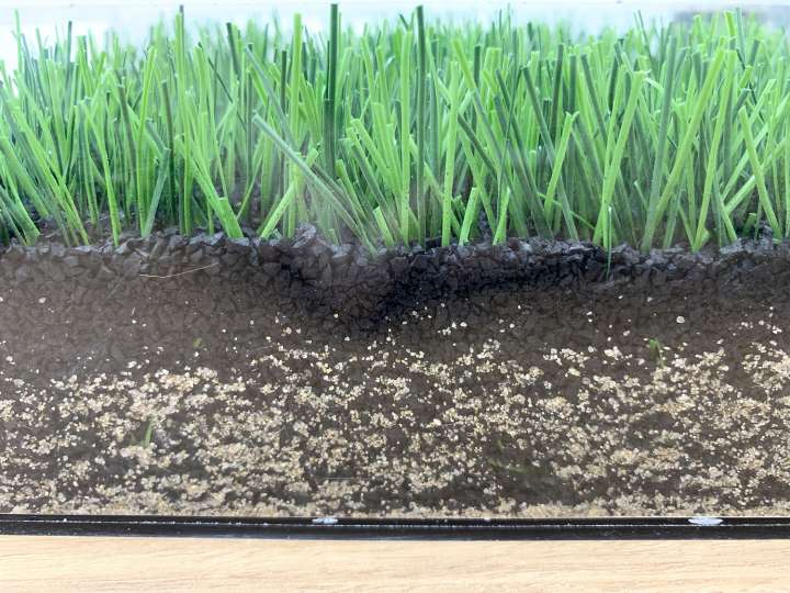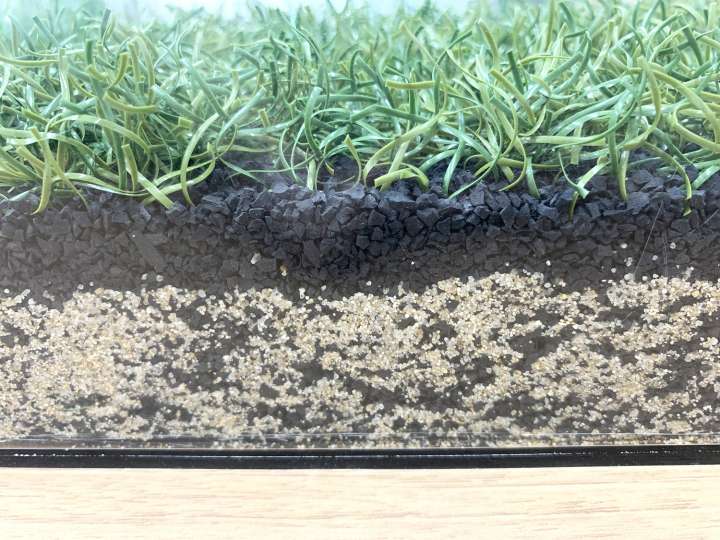 ▲一番下が砂で、黒い部分がゴムチップ。基本、人工芝にはこのふたつを敷いて、クッションの役割を果たす