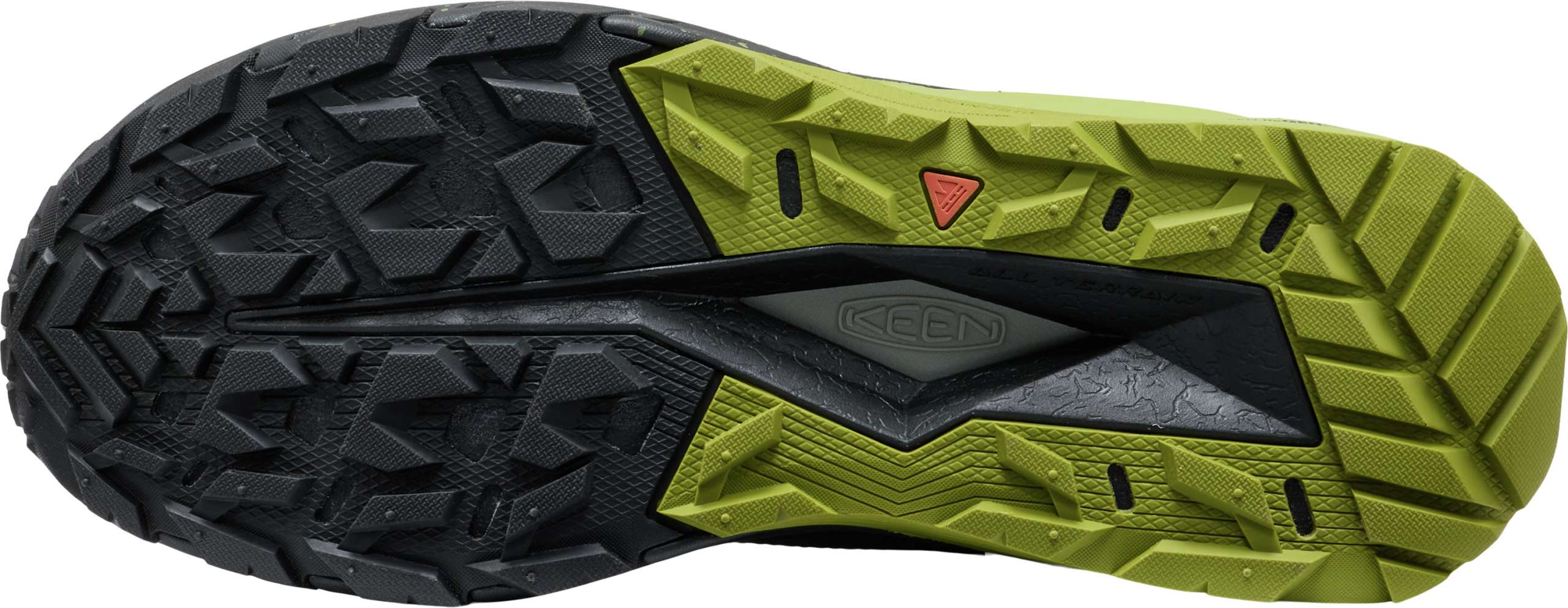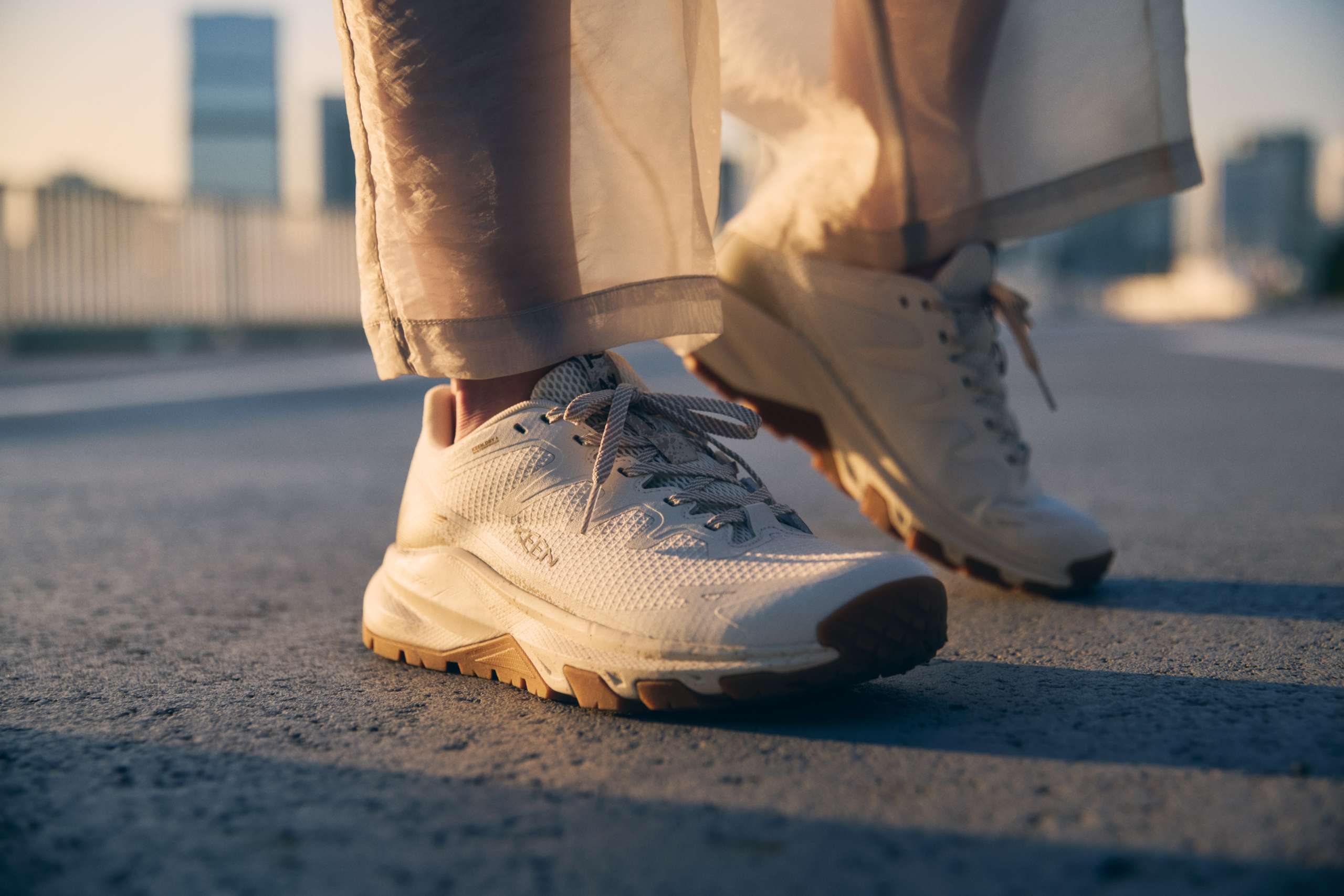 その柔らかいクッション素材を、耐久性のあるラバー素材のKEEN.TERRAIN SHIELDで包み込むことで、岩や障害物から守り、着地した際の横ブレを防ぐ安定性を付与。アスファルトでも土の道でもクセのない感触で、日常の移動距離が長い人にも扱いやすい仕上がりです。