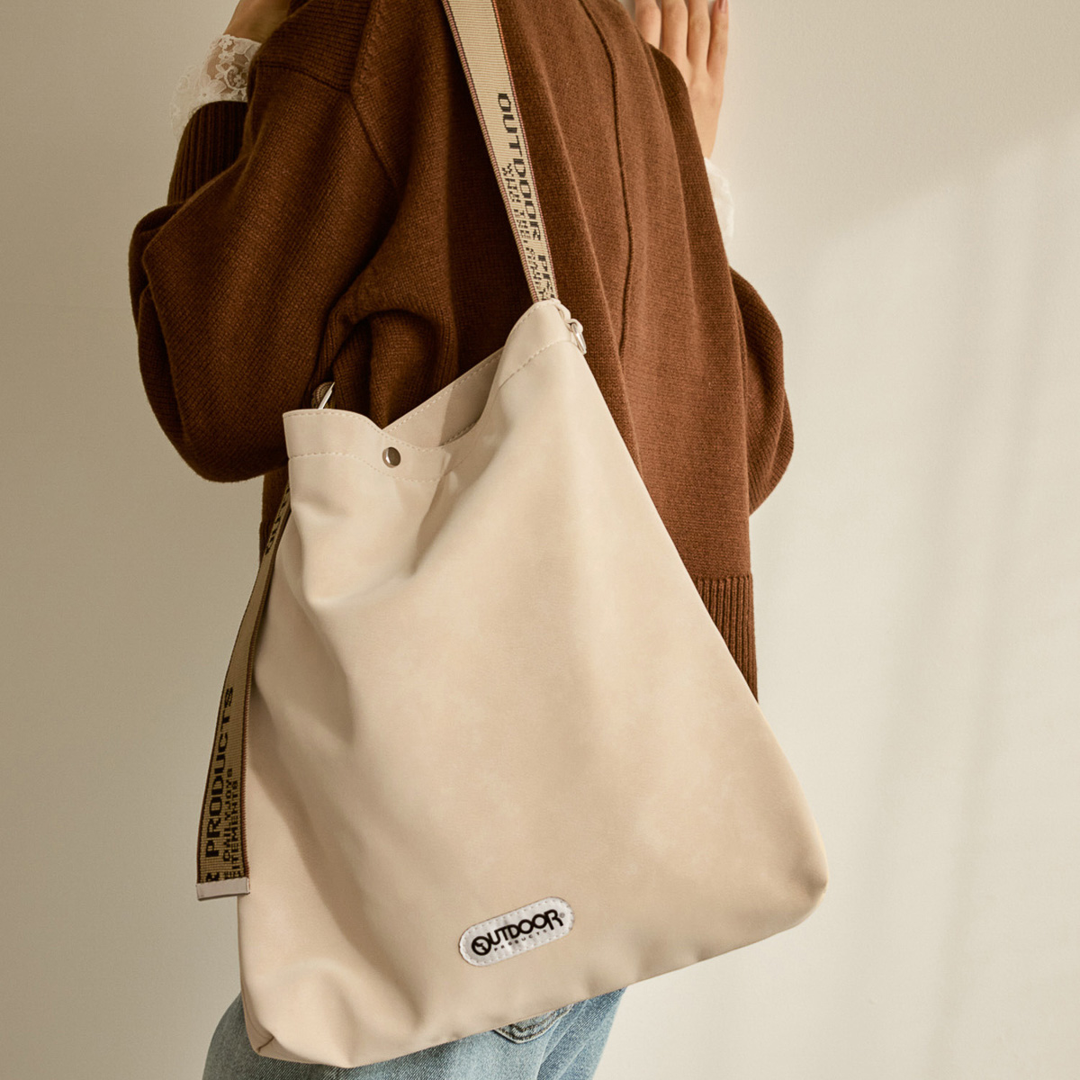 厚手のアウターを着る冬場でも、長さを調整すれば肩まわりに無理なくフィット。見た目だけでなく、扱いやすさの面でも冬コーデと相性のいいトートです。