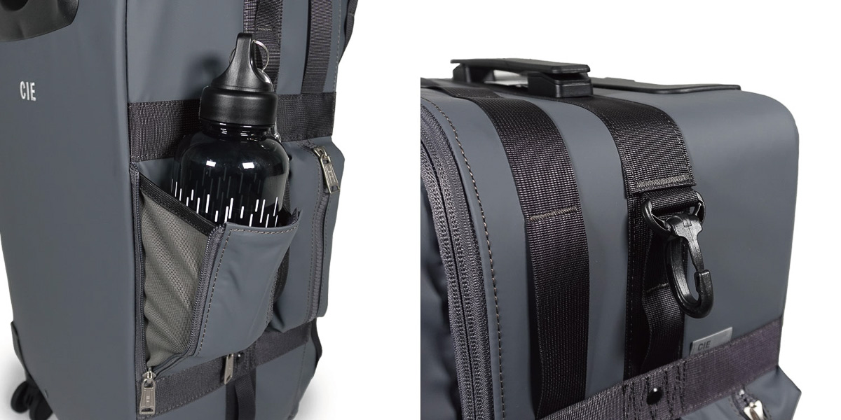 外装にも使い勝手を高める工夫が随所に。折りたたみ式のボトルポケットやファスナーポケット、樹脂製フックを備えており、フックにはショッピングバッグやコンビニ袋をさっと掛けておくことができます。