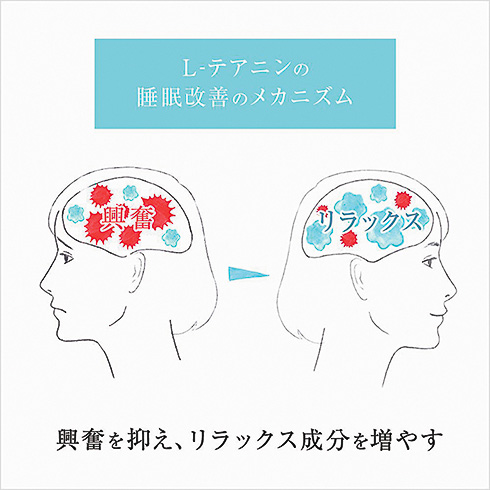 ▲リラックス成分を増やすL-テアニンが、同じ睡眠時間でもより長く寝たような満足感を与え、起床時の疲労回復感も高めると報告されている