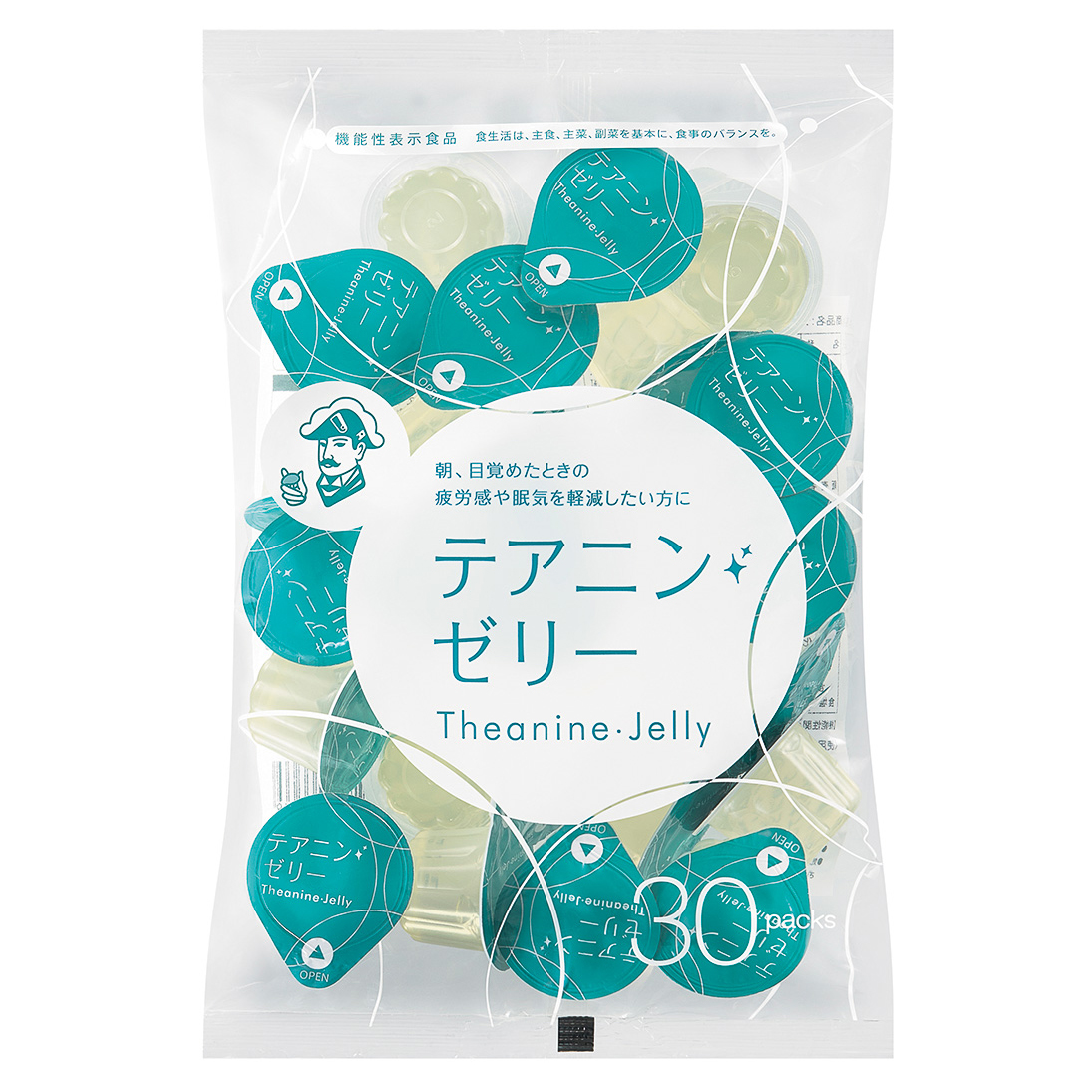 玉露や抹茶に多く含まれるアミノ酸の一種、L-テアニンを200mg配合することにより、睡眠改善効果が得られるゼリータイプの機能性表示食品。1袋30個入りで約30日分。