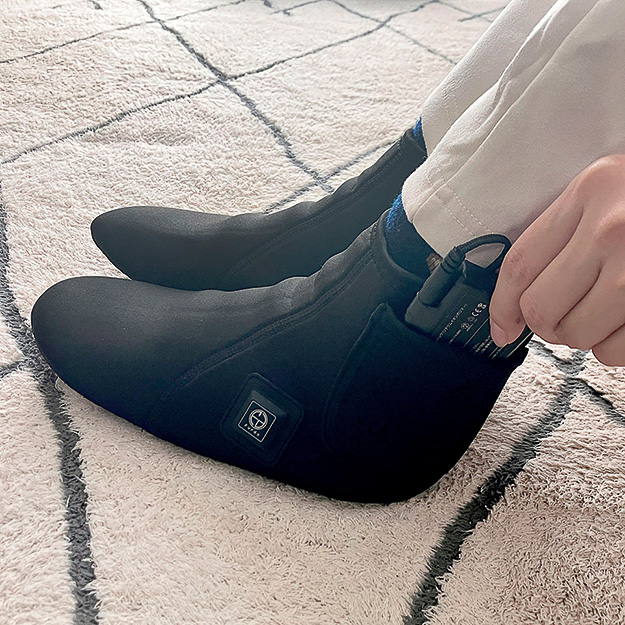 冬場の爪先や足首の冷えを対策する電熱ルームシューズ。コードレス設計のためストレスフリーで使用することができ、履いてスイッチを入れたら、わずか約10秒で暖かさが伝わり始める。