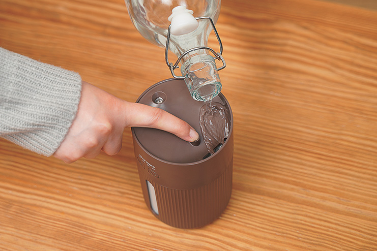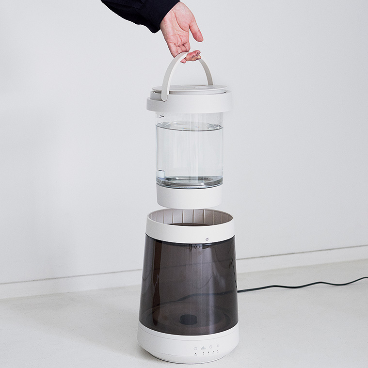 短時間でたっぷりの水分を放出して空間を潤し、4段階の照明モードが中の水の動きと呼応し、焚き火のような癒し効果も同時に提供。空焚き防止、サーモスタット、温度ヒューズを搭載した安全設計。