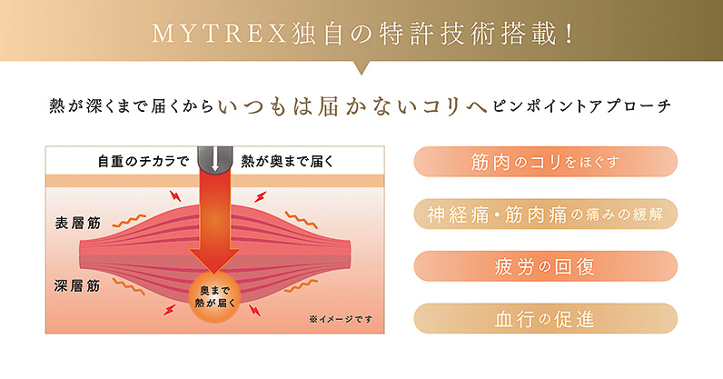 医療機器認証の取得は効果・効能が認められている証。筋肉を温めながらほぐしていくことで、冷えや血行不良が原因のコリや痛みが柔らぐ。