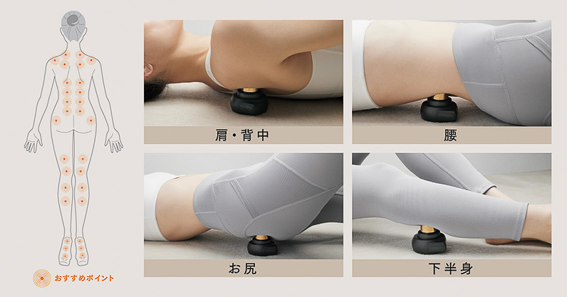 足裏から肩や背中まで、全身のあらゆる部分のコリに対応するのも魅力。温灸部が直接肌に触れないよう、衣服の上などから使用。