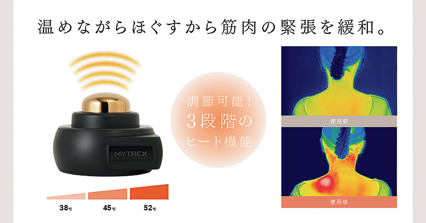 ヒート機能は、38℃、45℃、52℃の3段階。球頭に内蔵したスプリングにより高さの調整も可能で、自分好みの刺激で体をケア。