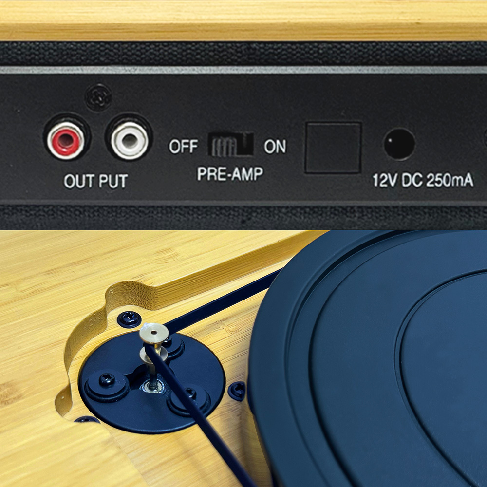 見た目はレトロでもリスニングスタイルは現代的で、RCA端子とAUX端子による有線接続(プリアンプ内蔵)以外にBluetooth接続にも対応。ワイヤレススピーカーやワイヤレスヘッドホンでも気軽にレコードを楽しめるのが特徴です。