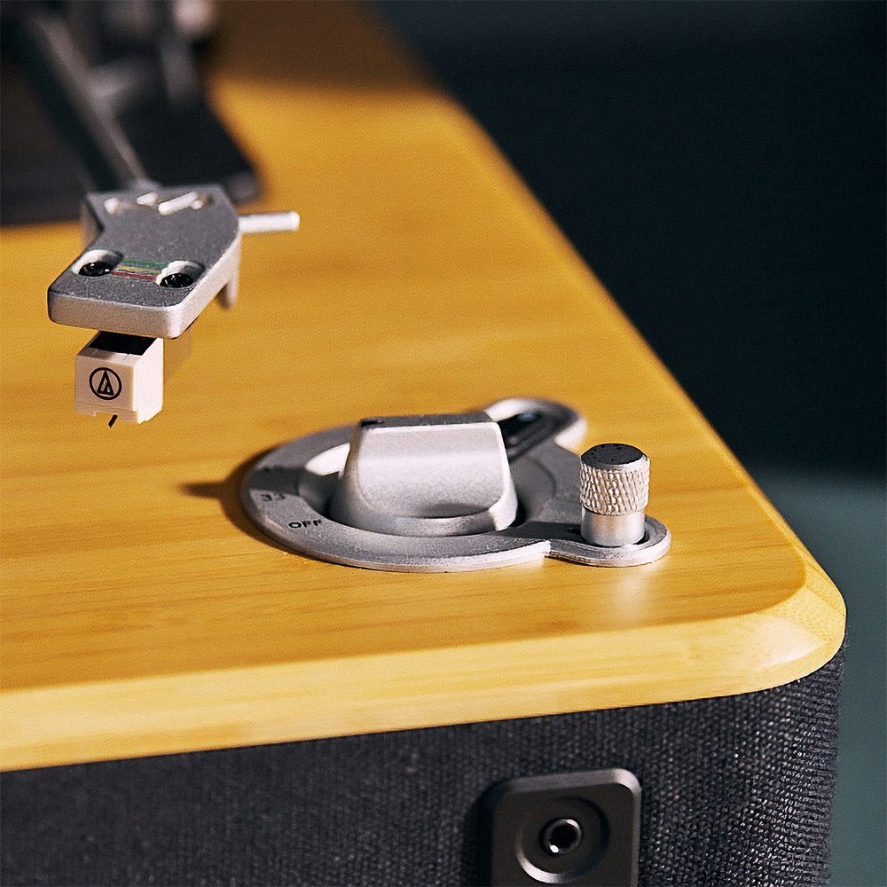 駆動方式はベルトドライブ式で回転数は33回と45回転。交換針には高音質と高耐久を兼ね備えたTechnica製AT3600Lスタイラスが使われており、レコード本来の温かみを残しつつも繊細なディテールも余すことなく再生します。