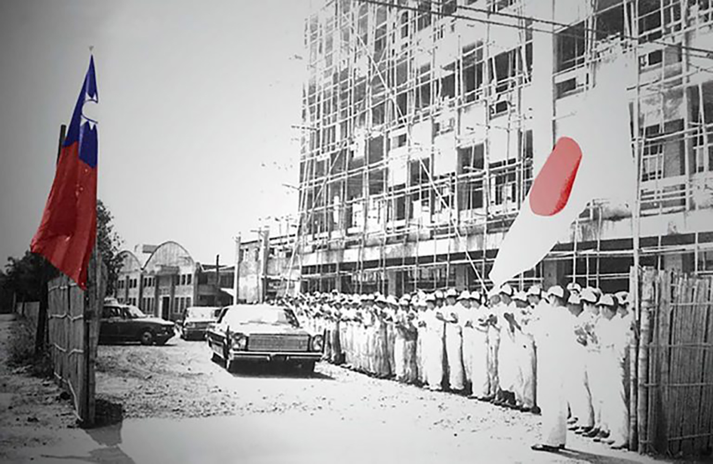 ▲光陽工業とホンダの技術提供締結前後、台湾に建設中だった工場へ見学に訪れた本田宗一郎が乗るクルマを見送る社員たち