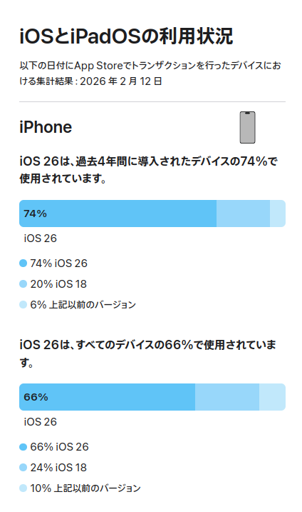 AppleはApp Storeで取引(購入やダウンロードなど)した端末をもとに、iPhoneユーザーのiOS使用状況を公開しています。2026年2月時点の最新データでは、iOS26は「過去4年以内のiPhone」で74%に到達している一方、「全iPhone」で見ると66%にとどまっています。