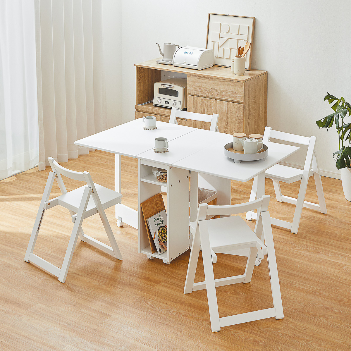 オール天然木の美しい質感を生かしたシンプルなデザインと利便性を兼ね備えた1台。テーブルを広げた際のサイズは140×80cmと大人4人でもゆったり。ホワイトは待望の新色。