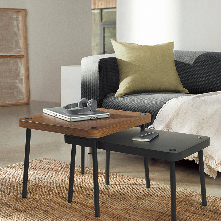 「限られた床のスペースを無駄なくスマートに使いたい」。そんな願いを叶えてくれるのがこのテーブル。少し重ねて置いたり、別々に使ったりとアレンジ自在。組み立ても簡単だ。