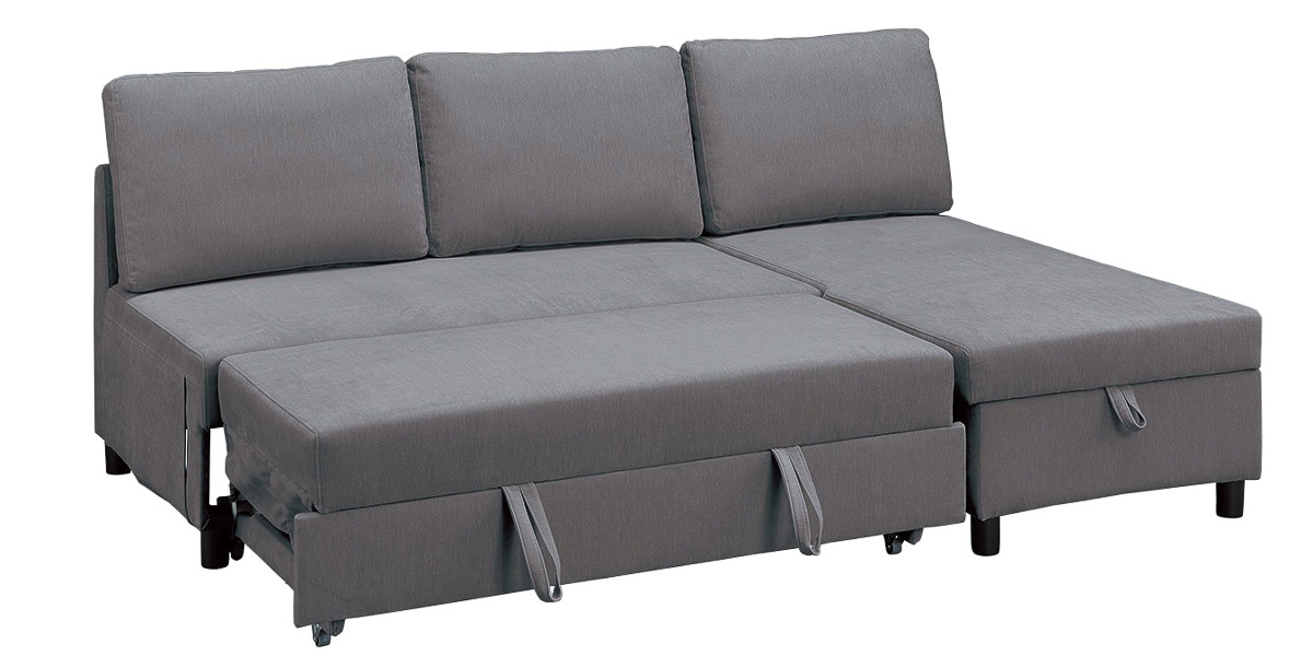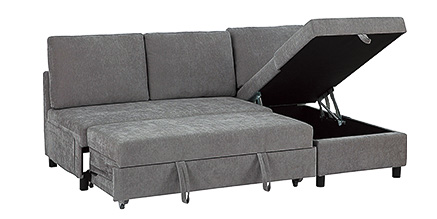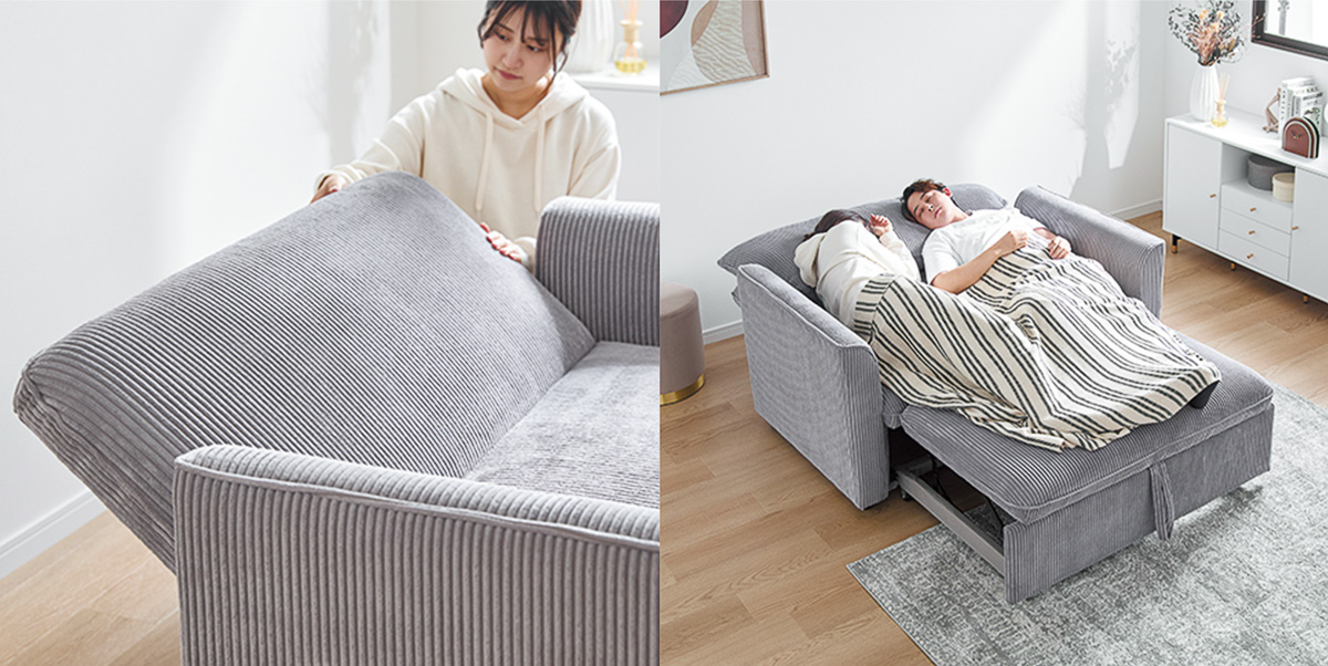 3人で足を伸ばしてもゆったり座れるカウチソファが、座面にある取っ手を引き出すだけで、さらに大きなベッドへと早変わり。加えて優れた収納力も備えており、コスパも抜群だ。