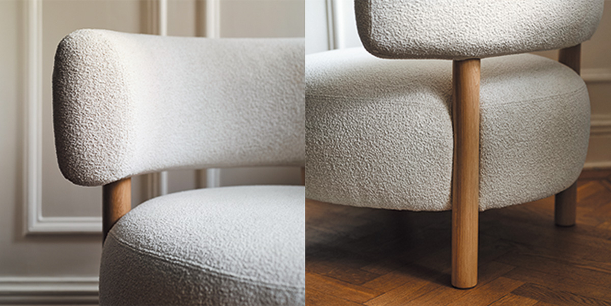木製のスタイリッシュなディテールと優しくゆったりとしたフォルムに、オーク無垢材がぬくもりを添え、ナチュラルかつ心地よい雰囲気を演出。美しい木目は1脚ごとに異なる。