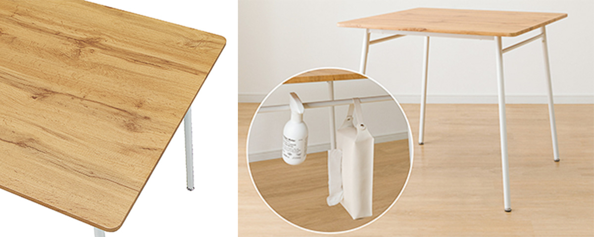 ▲別売りのフックを追加すれば、小物の整理にも重宝。テーブルの天板には木目調の塩化ビニル樹脂を使用し、汚れてもサッと拭けばOK