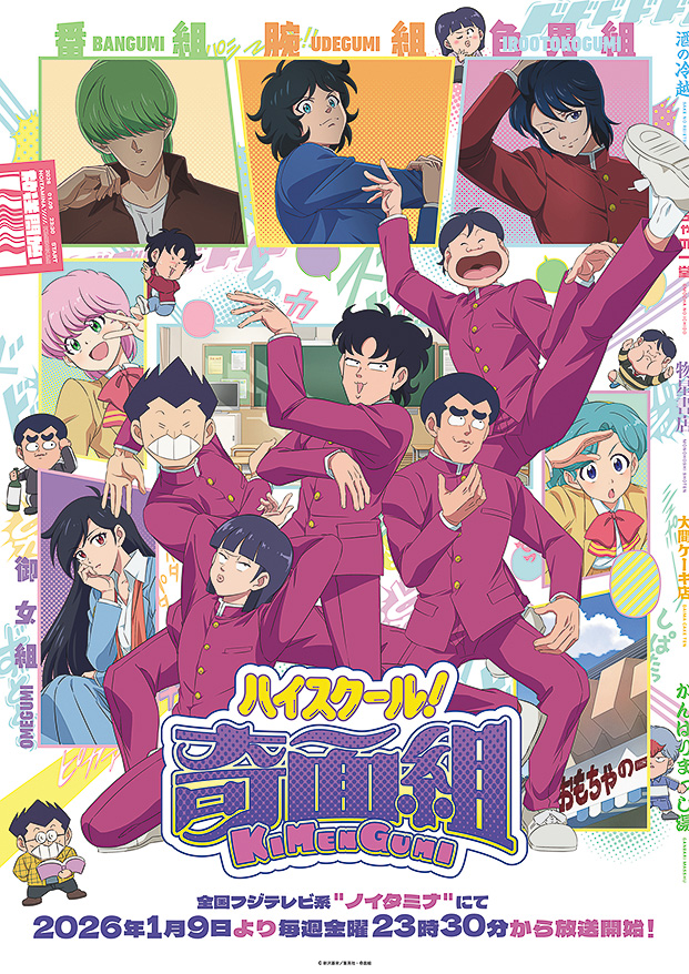 1980年に『3年奇面組』として『週刊少年ジャンプ』で連載がスタートし、主人公たちの進学に伴い改題。1985年にはTVアニメも放送され大人気に。新作では“令和の奇面組”に注目! 全国フジテレビ系“ノイタミナ”にて毎週金曜23時30分~ほか。