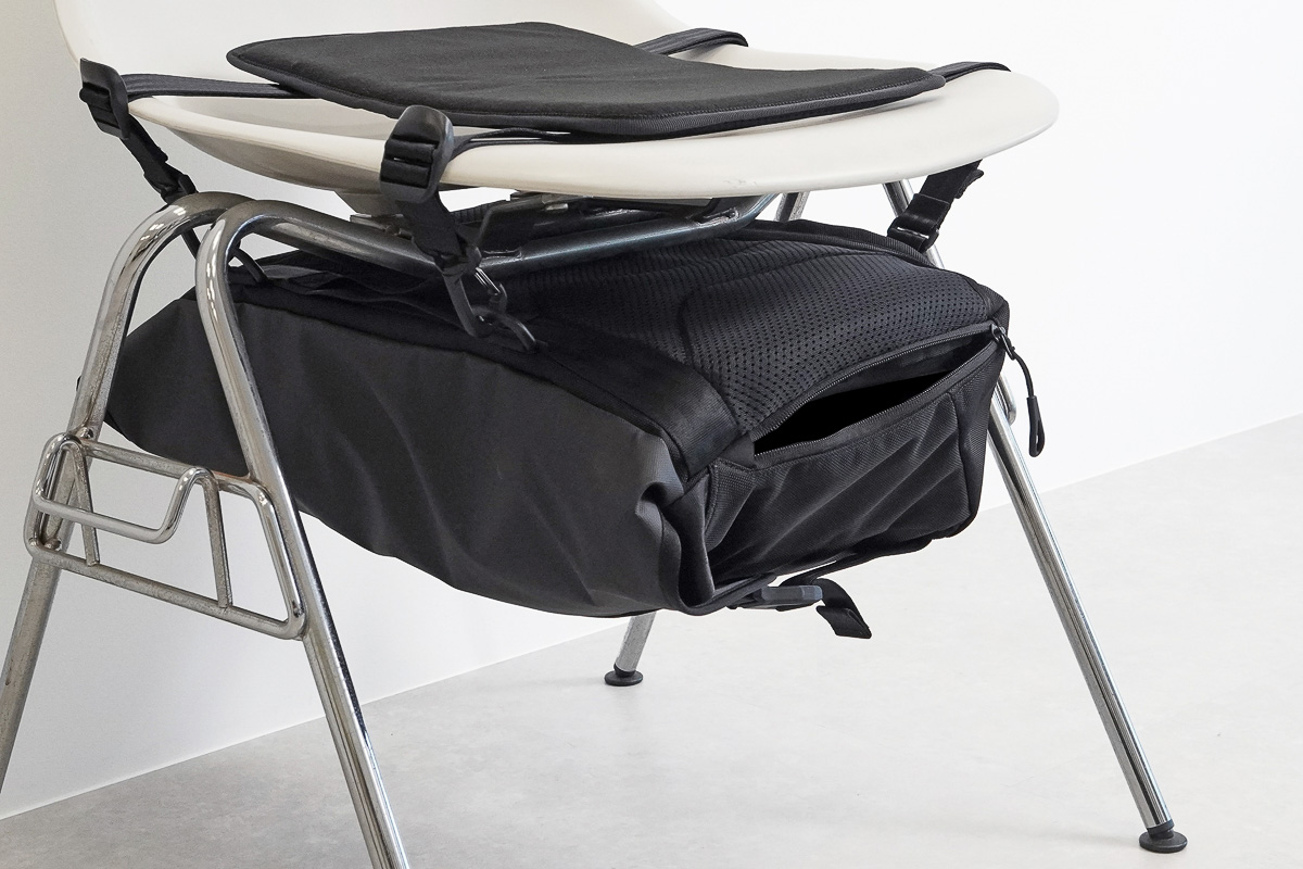 最大の特徴は座席下に吊るして使える“バッグハンギングシステム”構造。まずは、クッションマットを背面から抜きます。続いてバッグのサイドポケットに内蔵されたストラップを取り出し反対側のフックに掛けます。できた輪っかを座面に通し、長さを調整し固定すればOK。その上にクッションマットを取り付ければ準備完了と、慣れればわずか1分ほどで鑑賞環境が整うんです。