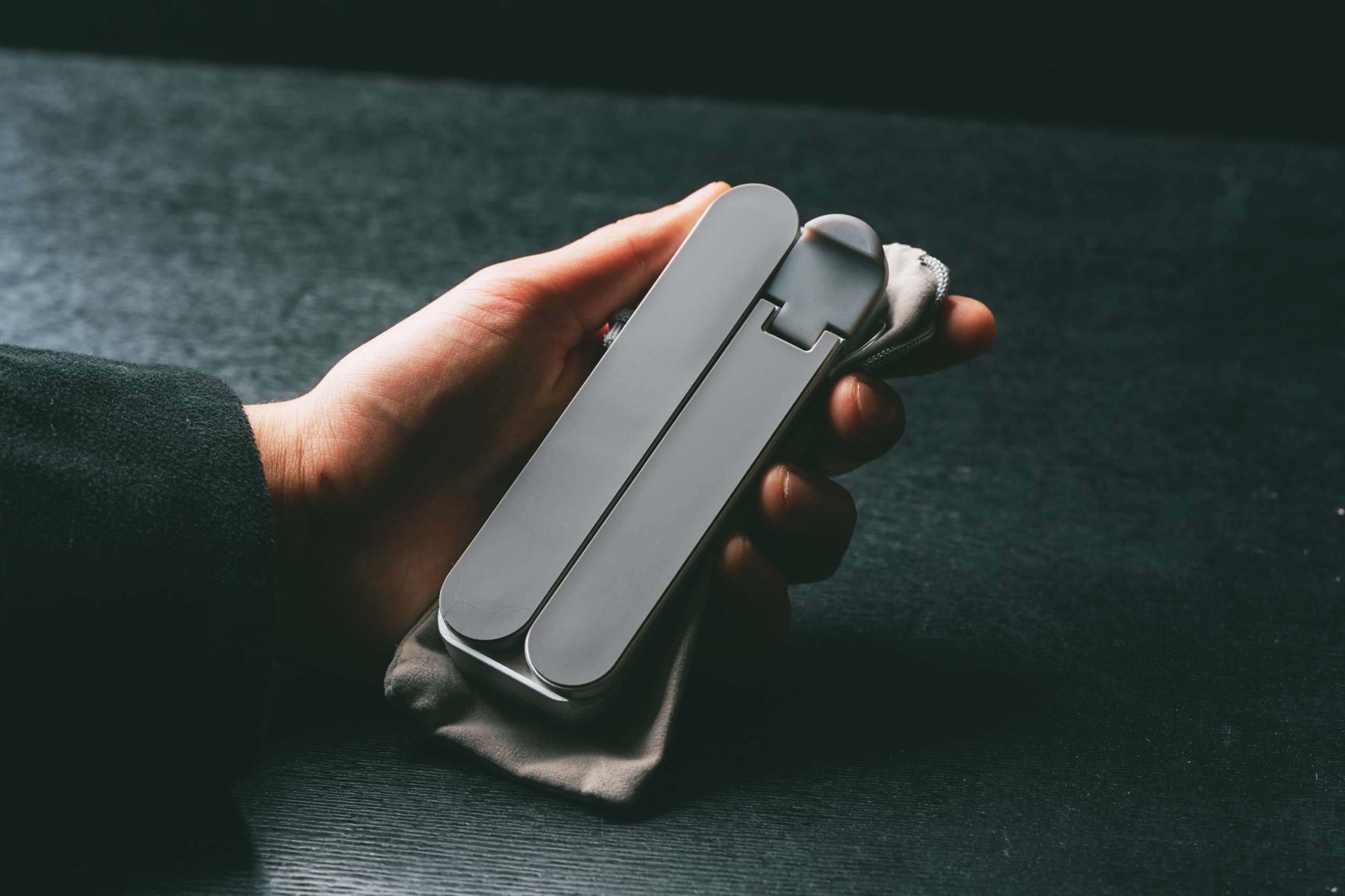 今回入本さんがピックアップしてくれたのはキングジムの折畳式モデル。最大の特長はそのコンパクトさにあります。折りたたむと約W44×D127×21mm、ほぼ手のひらサイズ。質量も約190gと軽量で、バッグに入れても負担になりません。