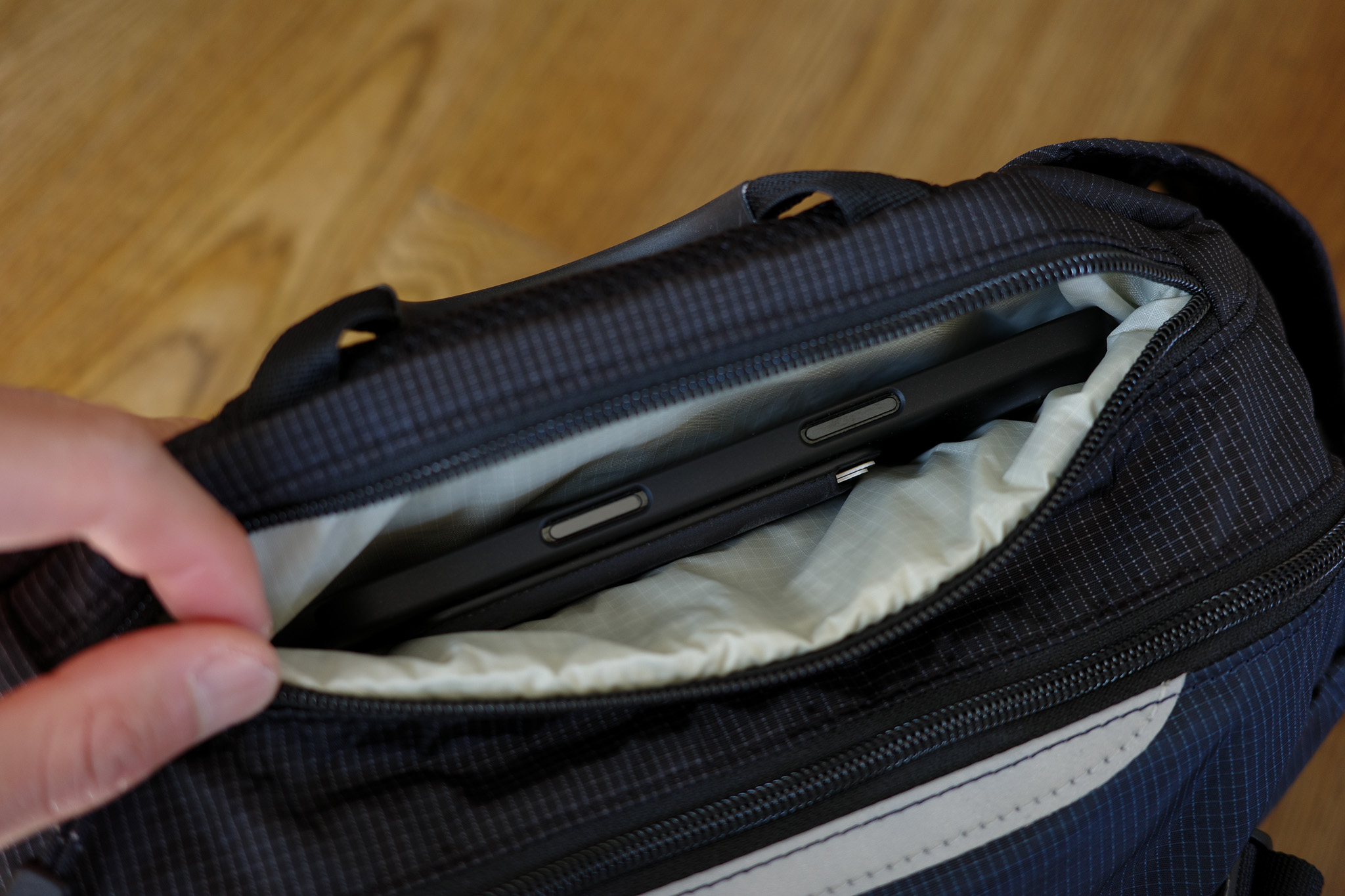収納スペースは大きく分けて2つ。トップ部分には、スマホなどを入れるのにちょうどいいサイズ感のポケットがあります。