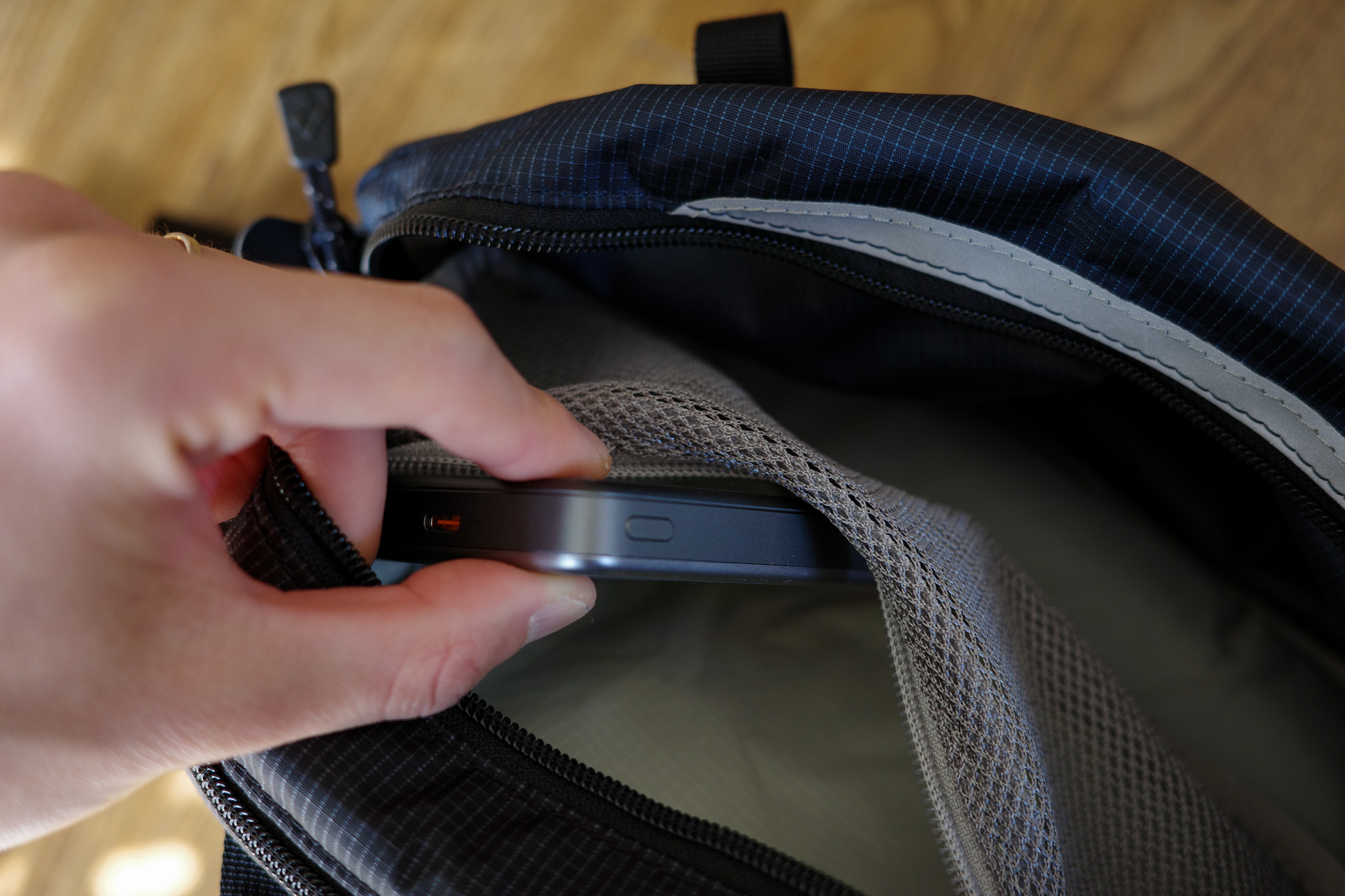 メイン収納部を開くと、まず目に入るのがメッシュポケット。モバイルバッテリーや鍵などの小物を入れるのに便利なサイズです。