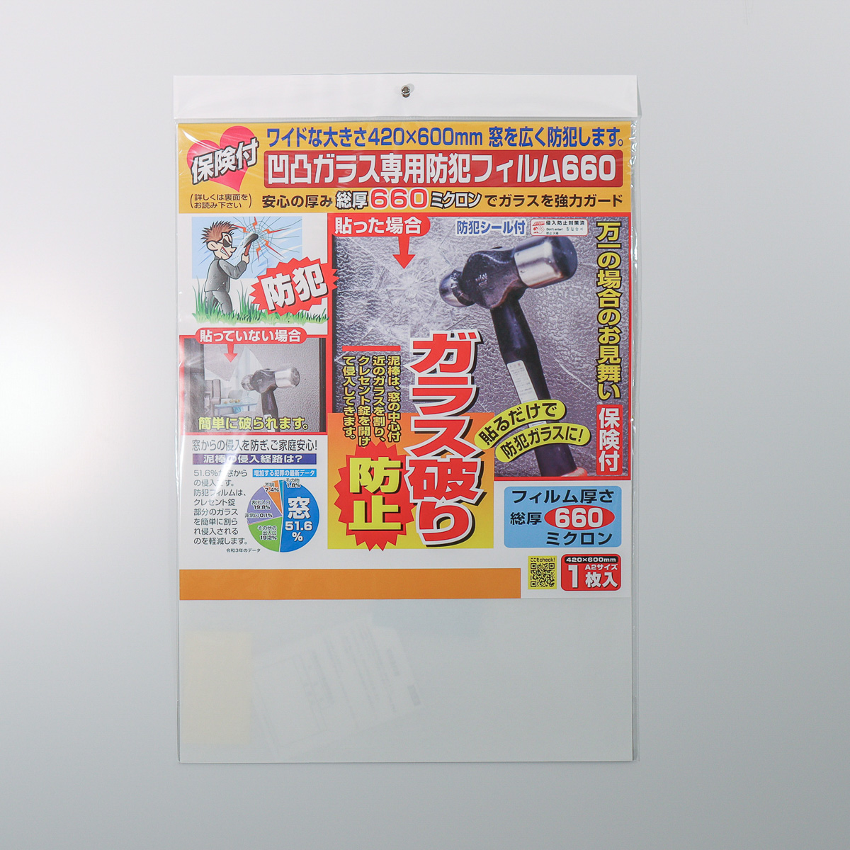 「保険付 ・ 凹凸ガラス専用 防犯フイルム 660ミクロン A2 1枚入 半透明」(5407円)