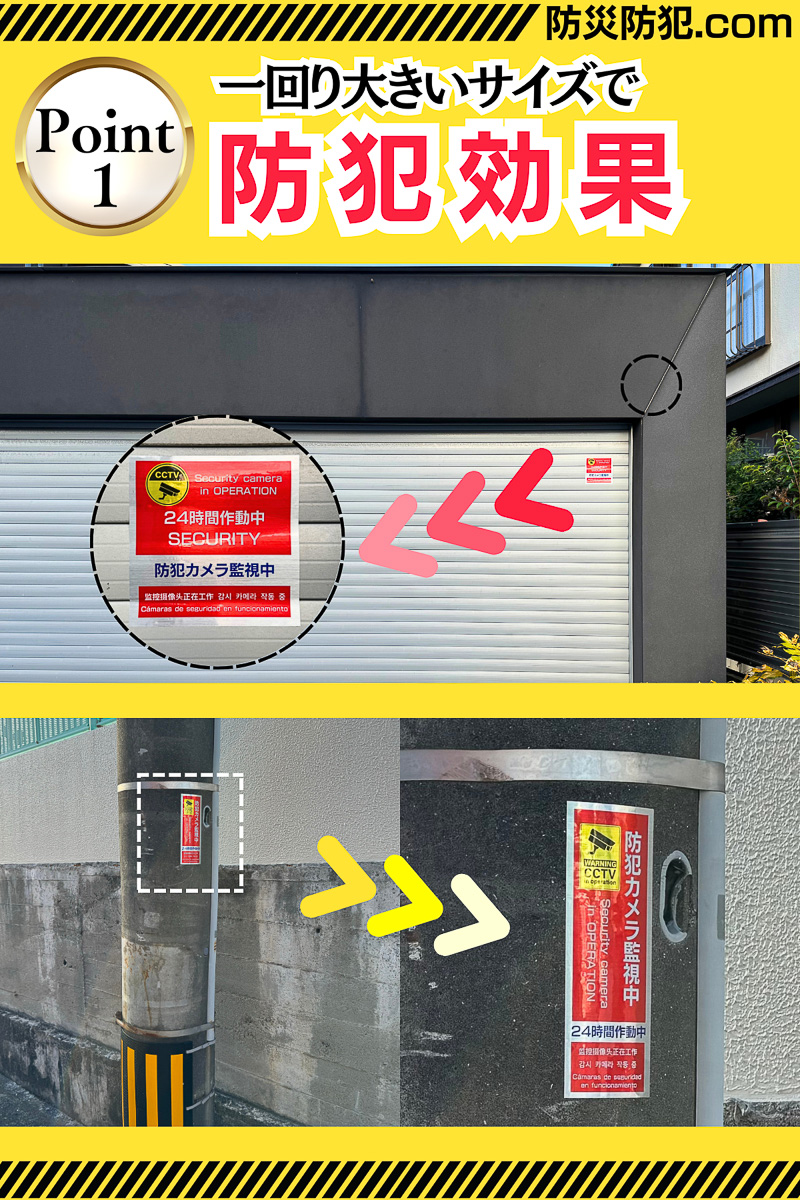 防犯対策されていることをアピールすることで犯罪者を遠ざけ、貼るだけで犯罪防止に繋がる警告ステッカー。ひと回り大きいサイズで視認性も良く、耐光・防水加工なのでインクの滲みもなく耐久面でも安心。