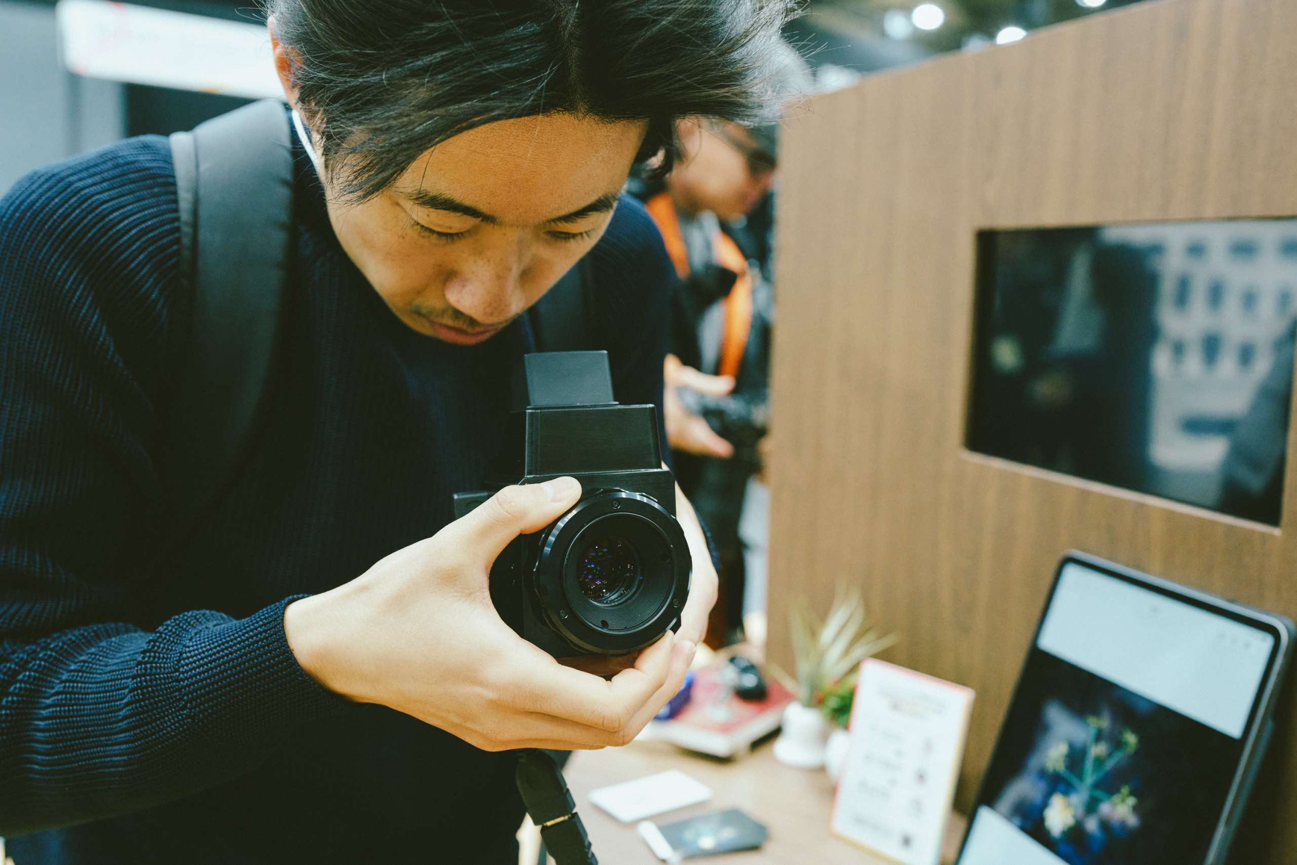 一方で印象的だったのが、Canon(キヤノン)のウエストレベルファインダーを備えたコンセプトモデル。上から覗き込むスタイルは、往年の中判フィルムカメラを思わせる構造でした。