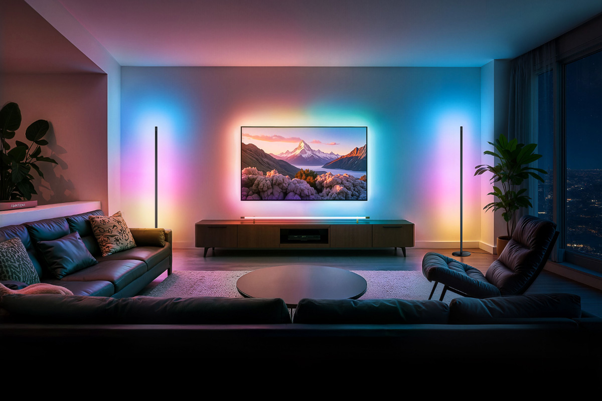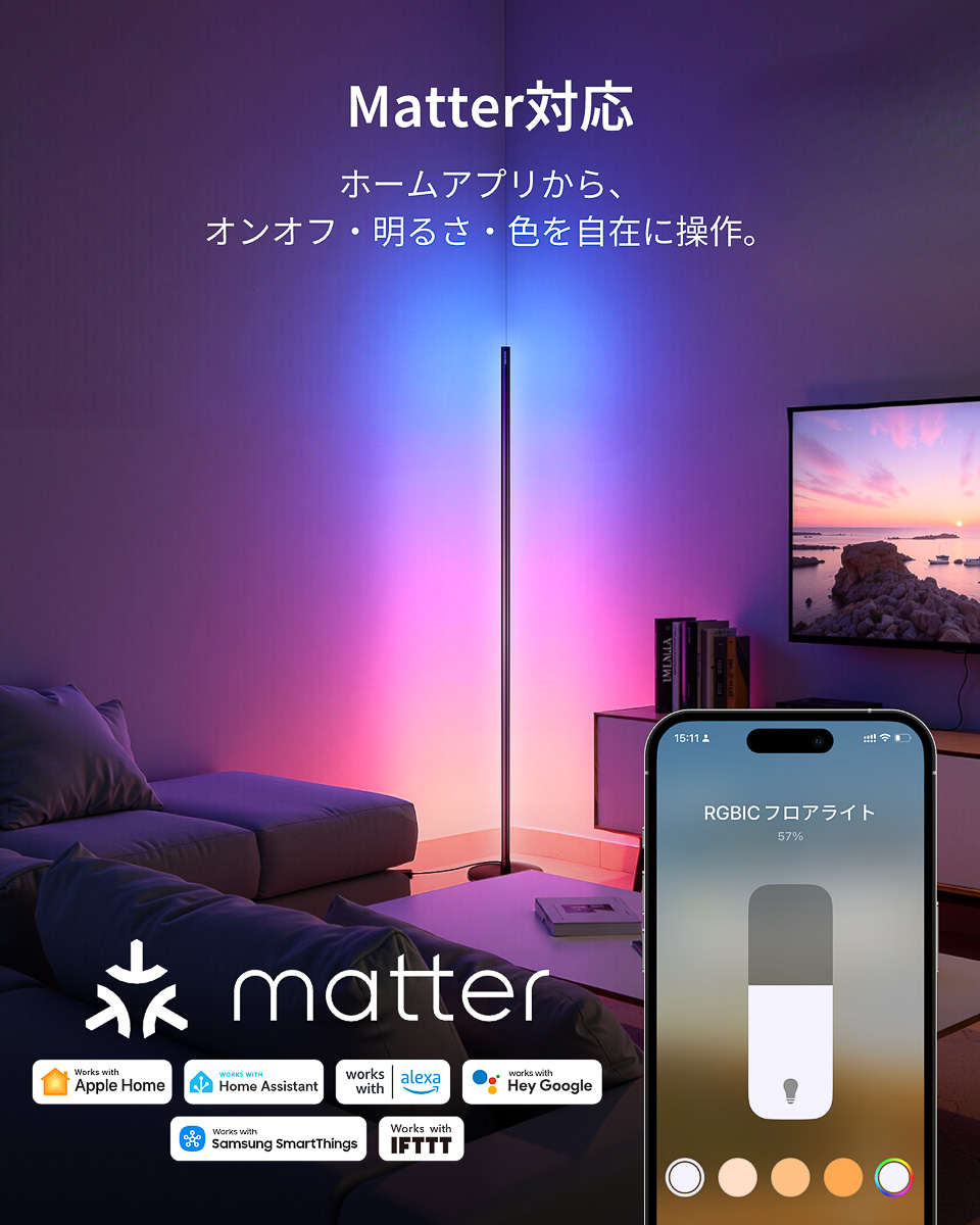 LEDチップの明かりを個別のICで細かくコントロールして発光させるRGBIC技術を搭載。昼光色や電球色はもちろん、約1600万色のカラーパレットから好きな色やパターンを自在に設定できる。スリムなので置き場所にも困らない。