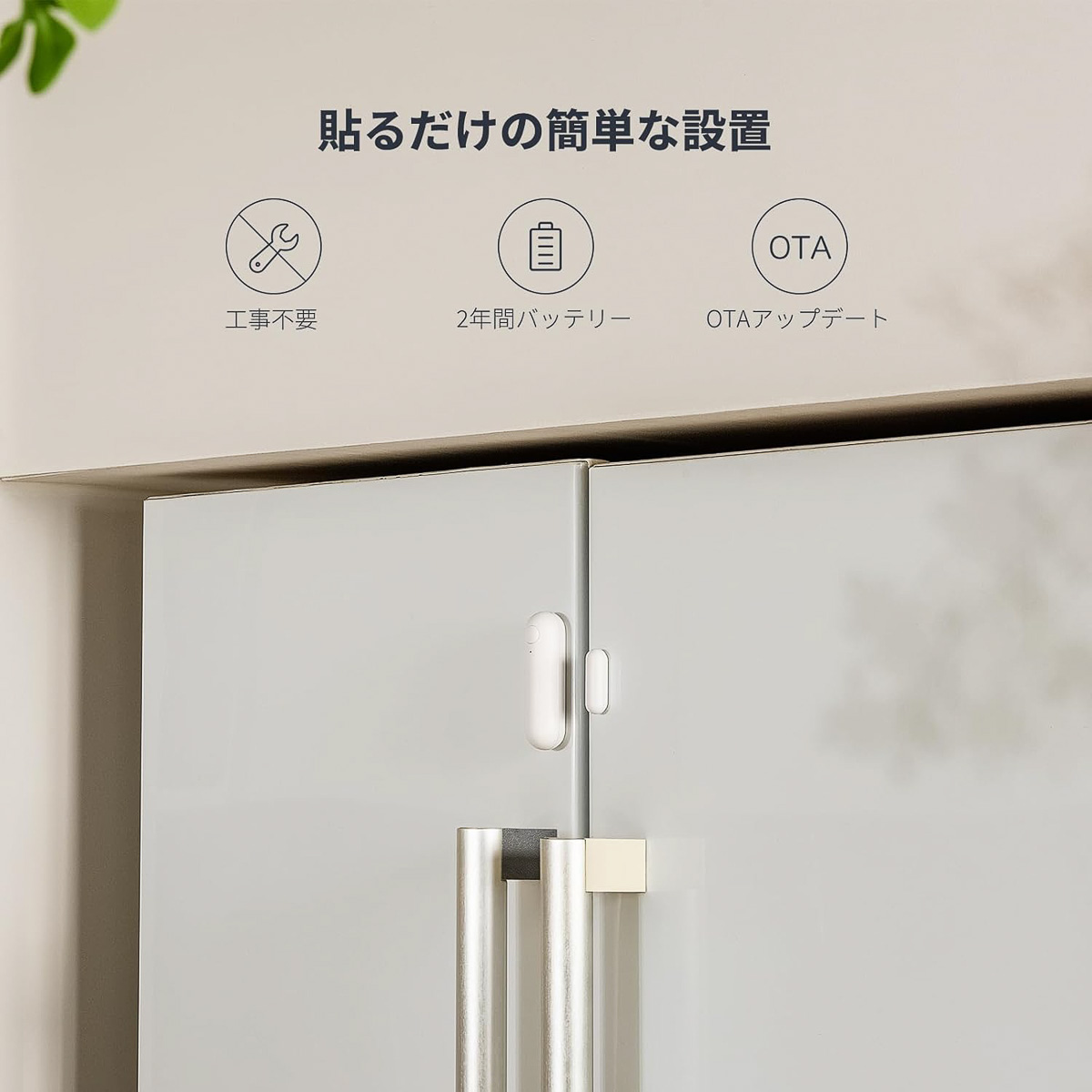 ドアや窓、金庫などどこでも簡単に設置できる開閉センサー。異常を探知するとリアルタイムでスマホに通知が届き、外出先でも直ぐに確認ができる。Apple HomeやGoogle Home、Alexaなどのプラットフォームとも連携可。