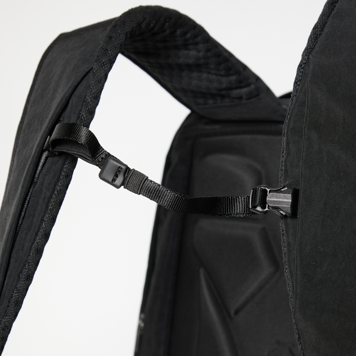 今季のアップデートで特に嬉しいのは、体に沿うオリジナルパターンへと改良されたショルダーハーネスと、歩行時の左右の揺れを抑えるチェストベルトが追加されたこと。駅の階段を急いで登る時も、バッグがピタッと背中に追従してくれます。クッション入りのPC収納スペースには雨が染み込みにくい「はっ水ファスナー」を採用しており、本体のはっ水加工と合わせて急な雨対策も万全です。