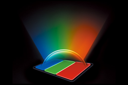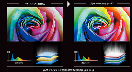 ▲発光層を4層に増やした新パネルにより、高コントラストと広色域化を実現。パネルが発した熱を逃がす独自技術「サーマルフロー」採用する