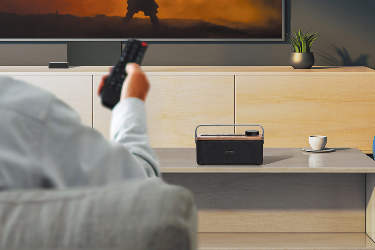 ウッド素材の上質な手元スピーカー。2.4GHz帯のデジタルワイヤレス伝送を採用し、映像と音のラグを最小限に抑制している。TV自体の音量を上げずとも、手元でハッキリと音声やサウンドを楽しめる。