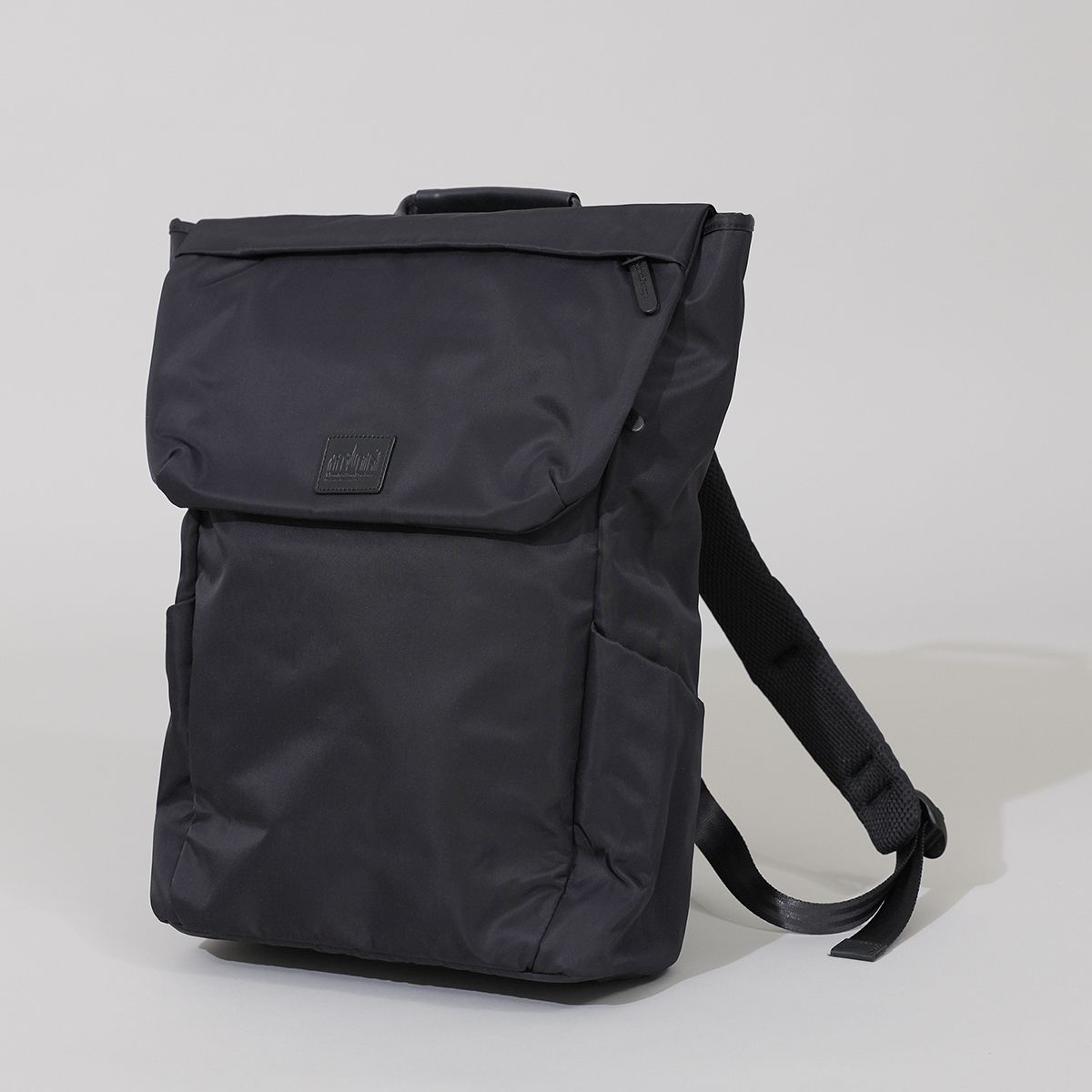 パーツも含めてオールブラックのリュックはビジネスシーンにもマッチしつつ、フラップ型でカジュアルな雰囲気も併せ持つ、まさにオンオフ兼用にぴったりなリュックです。
