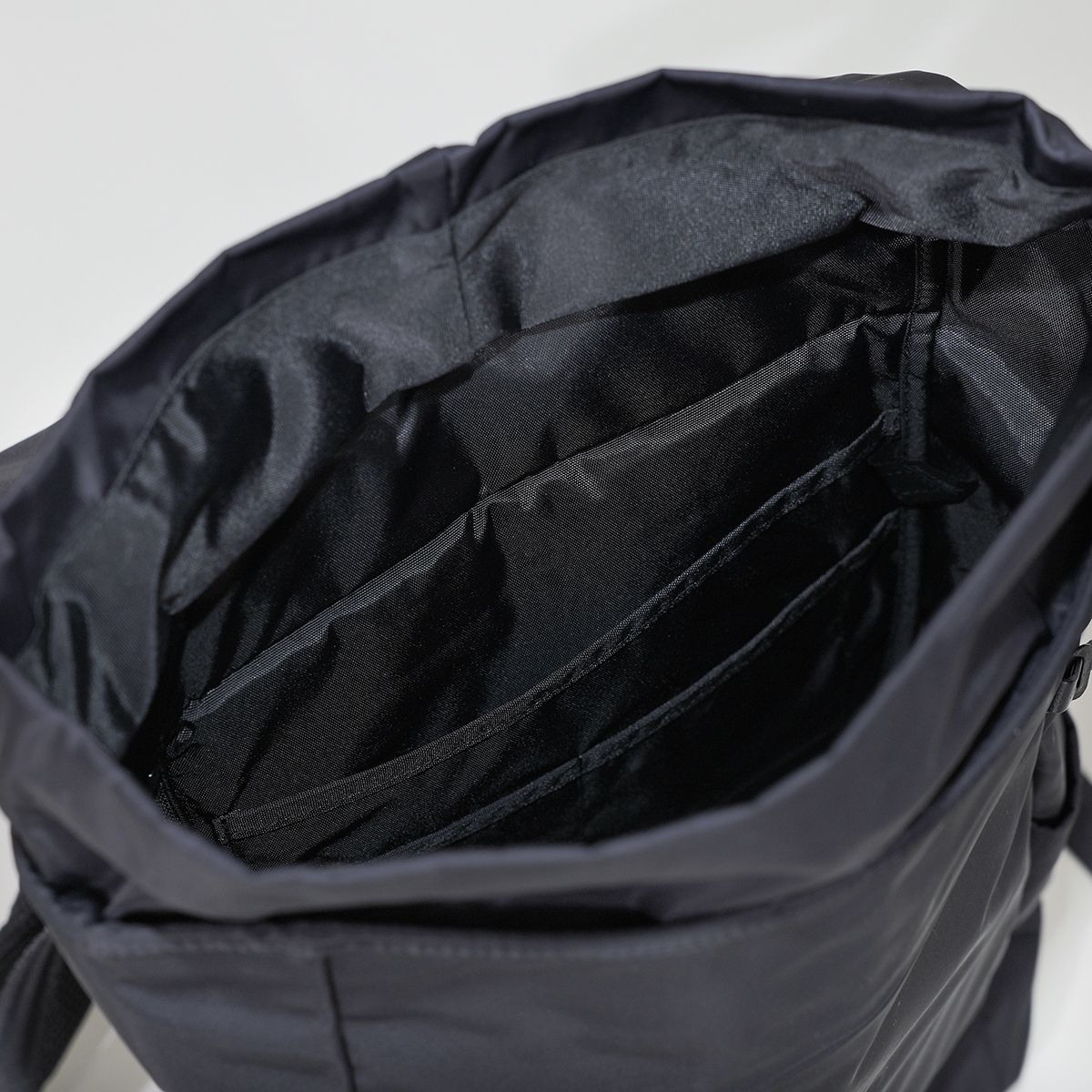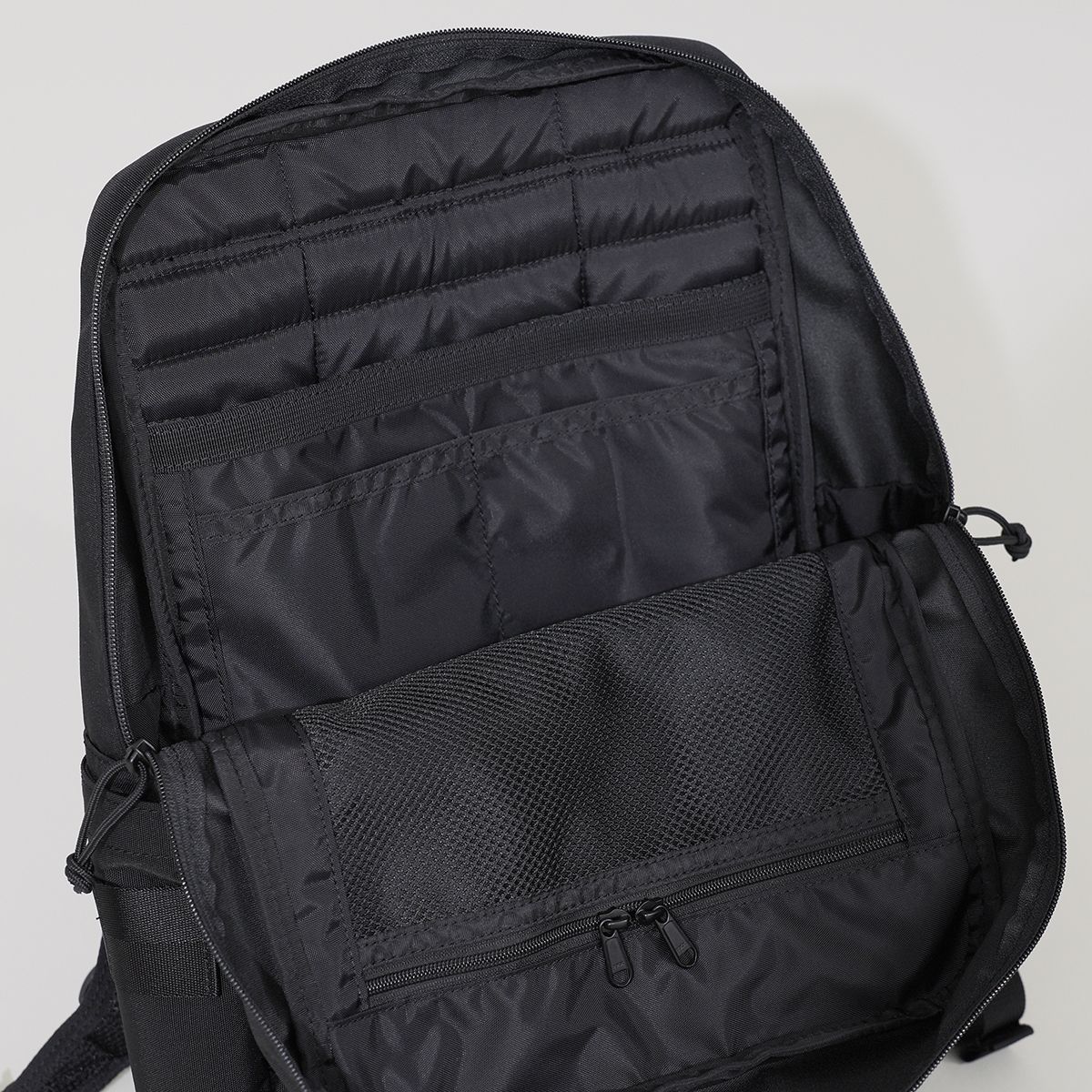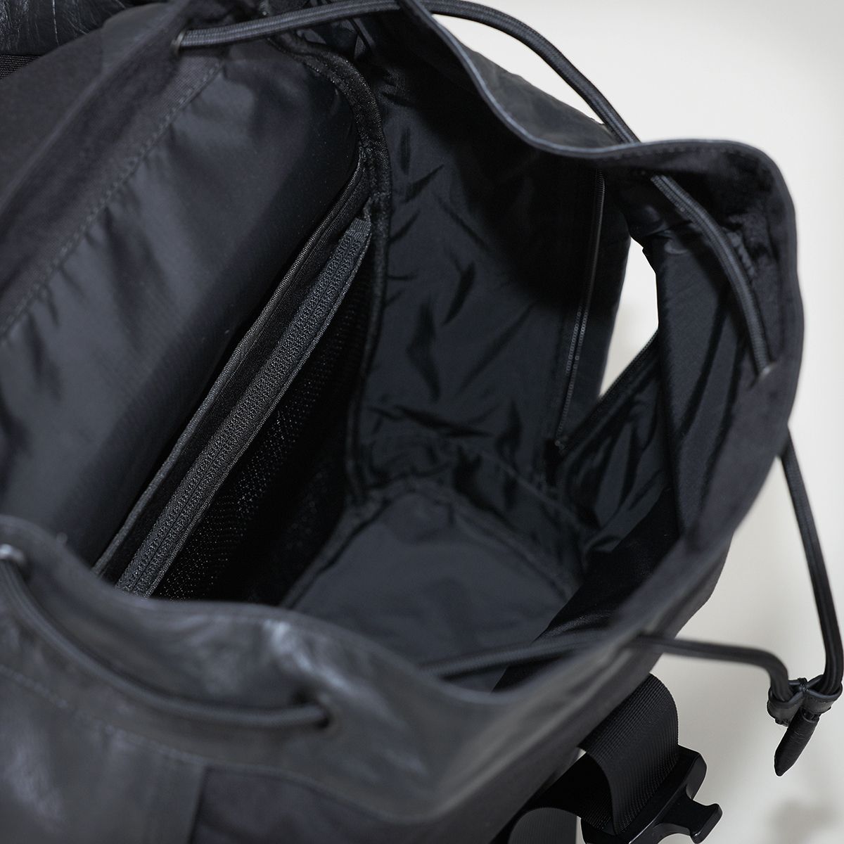 生地裏面にPVC加工を施しているのでハリ感があり、荷物が少ない場合も型崩れしにくいのも特徴。見た目以上に荷物が入るので、オンオフ問わずどんなシーンでも活躍してくれるリュックです。