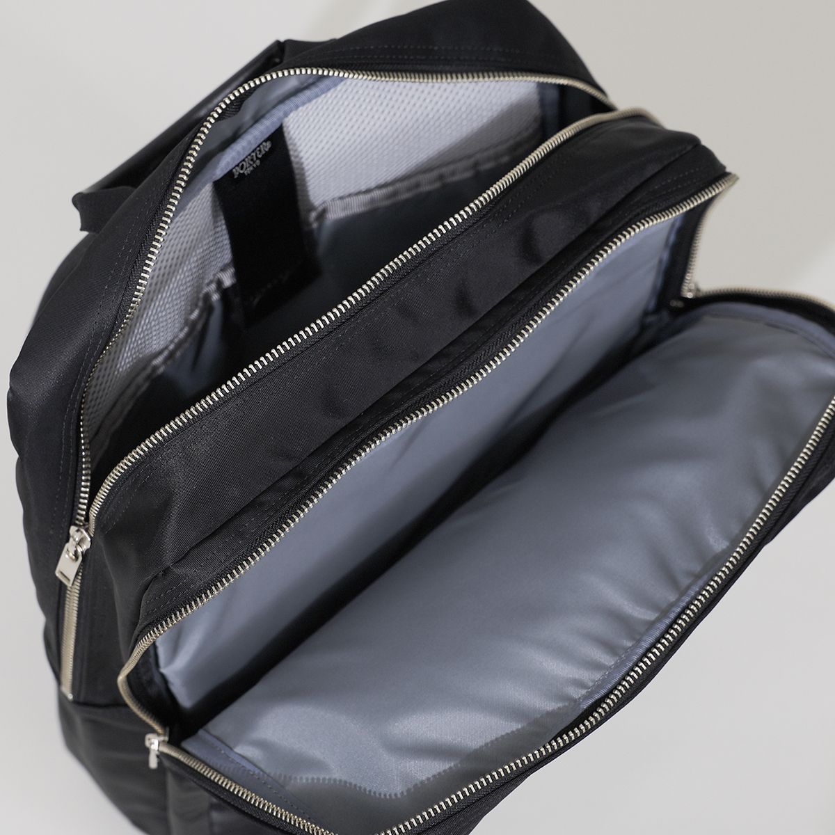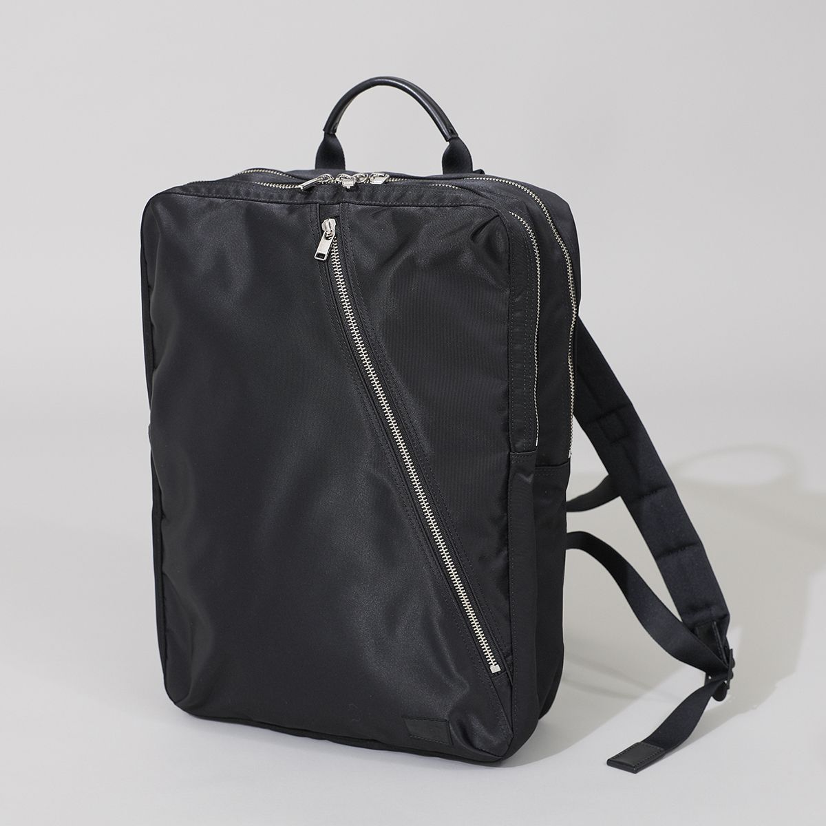 特徴は光沢のある超高密度ナイロンツイル素材のフォーマルにもカジュアルにも馴染む独特の風合い。この「DAYPACK」は、フロントのファスナーを斜めに入れることでバッグを前に抱えた際にポケットから荷物を出し入れしやすい仕様に。