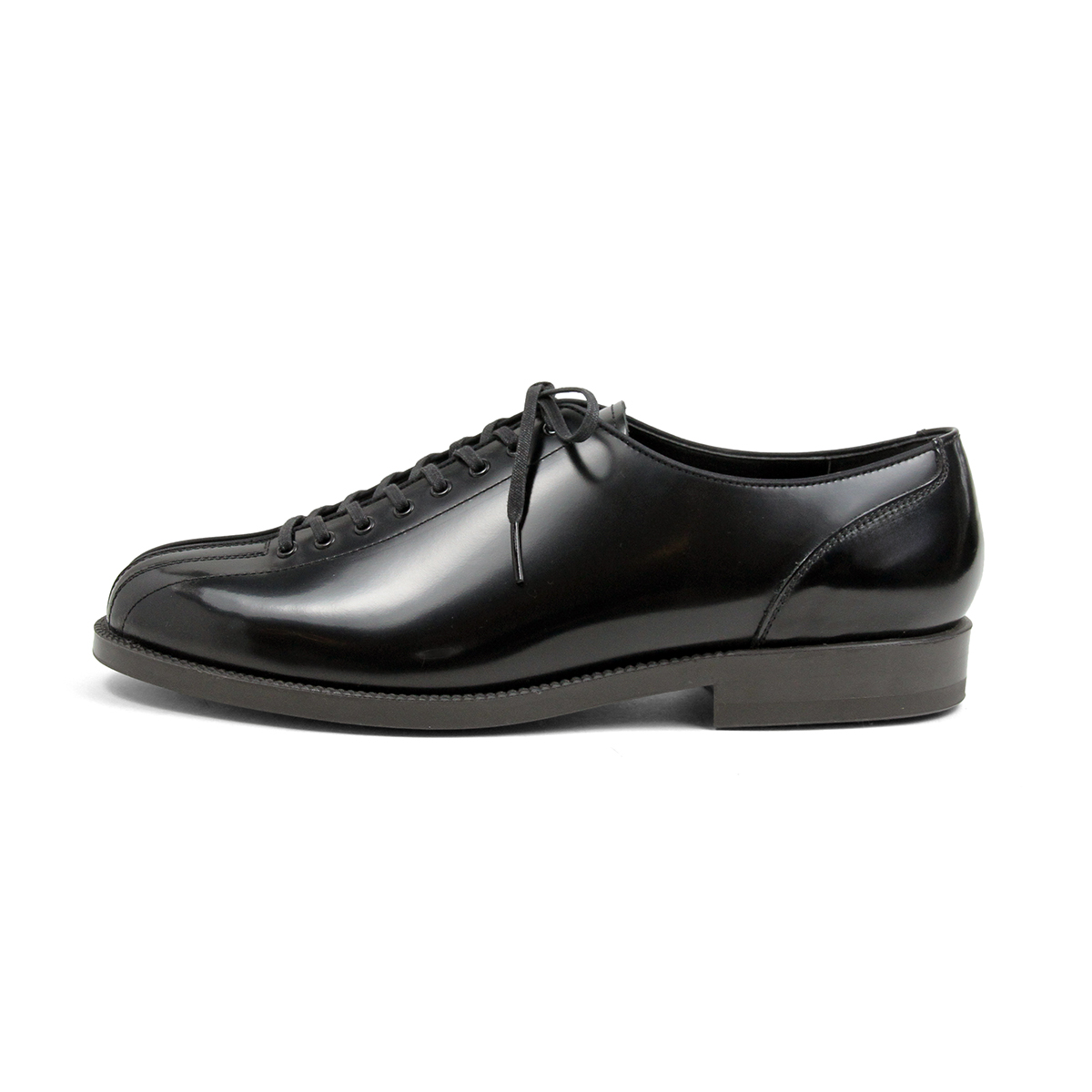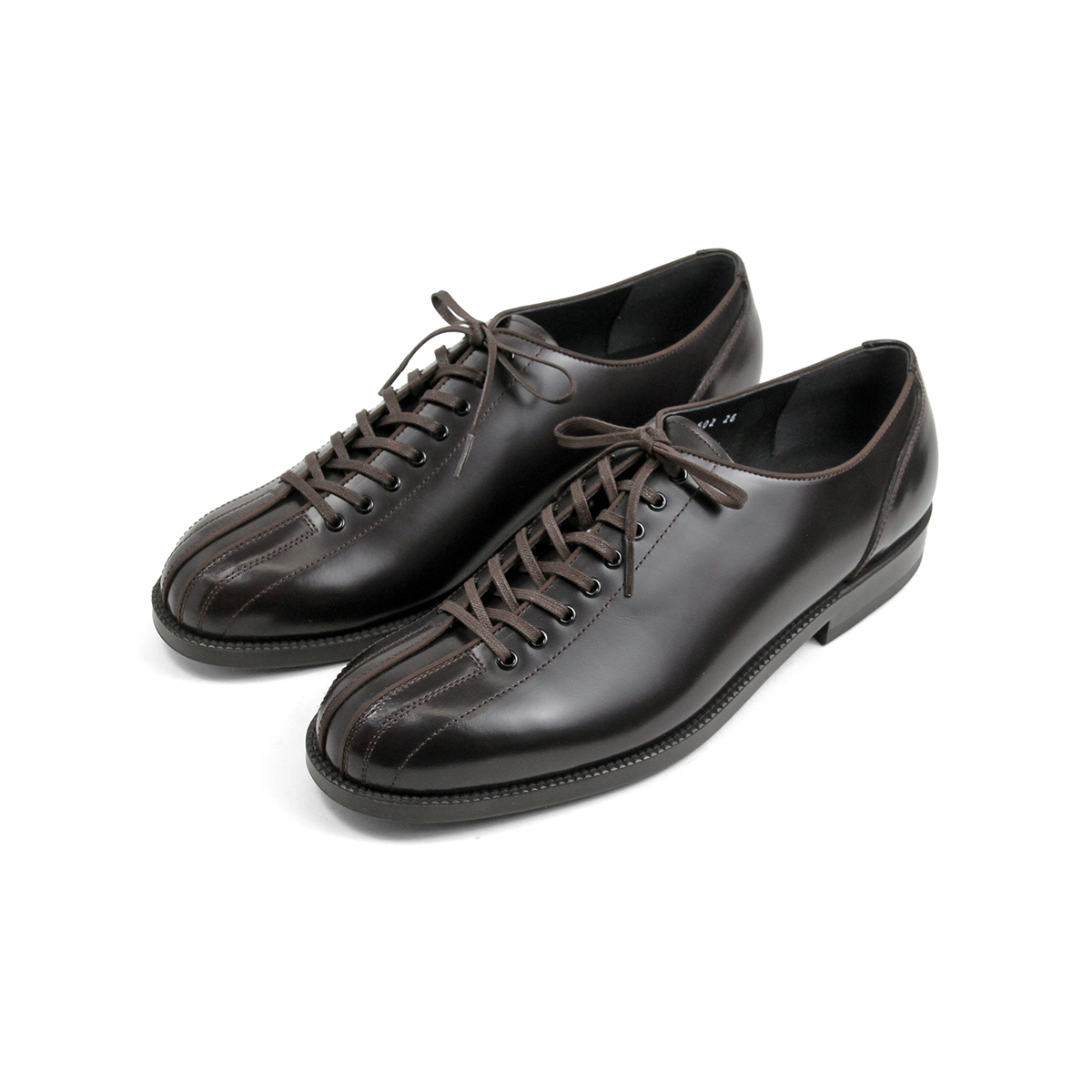 同ブランドらしい光沢のあるガラスレザーを採用したアッパーがクラシカルな空気感をちょうど良いバランスに。レトロなテイストなのに野暮ったく感じないのはこの素材が持つ雰囲気によるところが多大にあります。また、往年のボウリングシューズらしい8つのシューホールが特徴的で、革靴らしさとスポーツシューズらしさ、その両方の良さが合わさったような佇まいを構築しています。