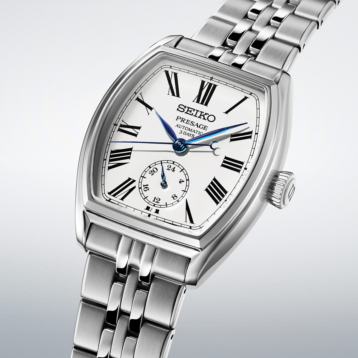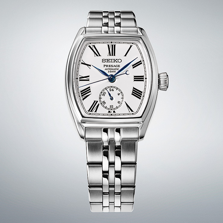 エレガントな佇まいから、ここ数年で人気が高まっているのがトノー型。本作はプレザージュ唯一のトノー型モデルで、その端正なフォルムが上品さをいっそう引き立てている。