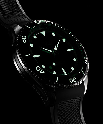 ▲針とインデックスにはスイス製ルミノーバを塗布。水中でも高い視認性を確保する、ダイバーズらしい意匠だ