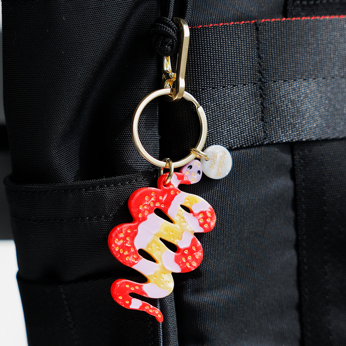 初めてバッグチャームを試すのであれば、やはり最初はシンプルなバッグに派手すぎないチャームを付けるのが間違いない方法。ご覧のようにインケースのミニマルなバックパックにさりげなくワンポイントの要素としてこんなキーホルダーを付けるのがちょうど良いでしょう。まずは“やりすぎない・派手すぎない”こと、これがキーワードとなります。