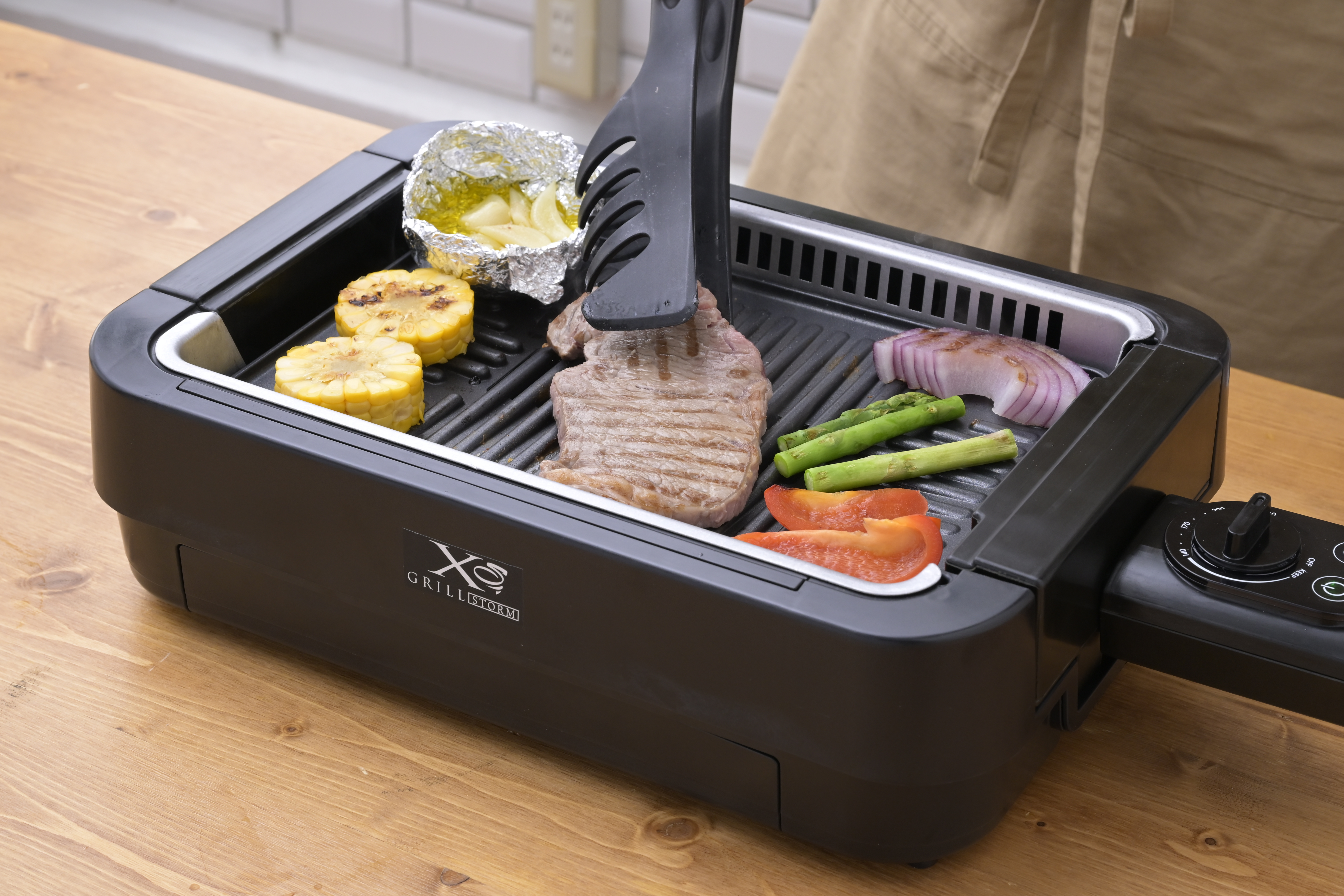 山善「吸煙焼き肉グリル XGRILL STORM」(1万800円)は、自宅での焼き肉最大の悩みである煙と油ハネを解決!内蔵した強力ファンが調理中に発生する煙を吸い込み、室内への拡散を大幅に抑制します。さらに、独自のプレート構造により余分な油が下の水受け皿に落ちる設計で、煙の発生源そのものをカット。高火力のヒーターを搭載しているため、厚切りのお肉もジューシーに焼き上げることが可能で、家での食事が特別なイベントに変わります。