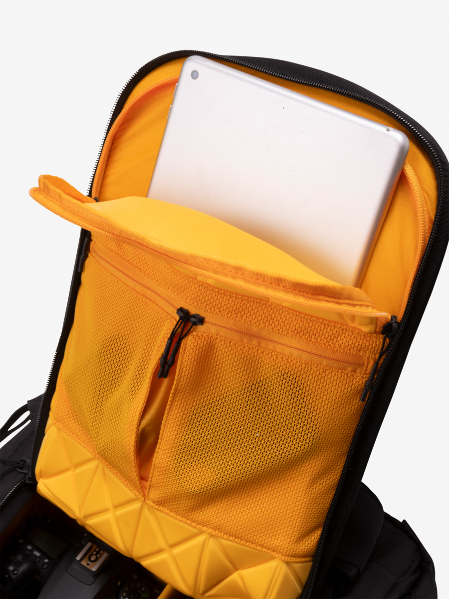 ▲背面パネル側にはPC収納ポケットや、細かな収納ポケットが多数配置されており、SSDやワイヤレスマイク、バッテリーなどの収納もバッチリ