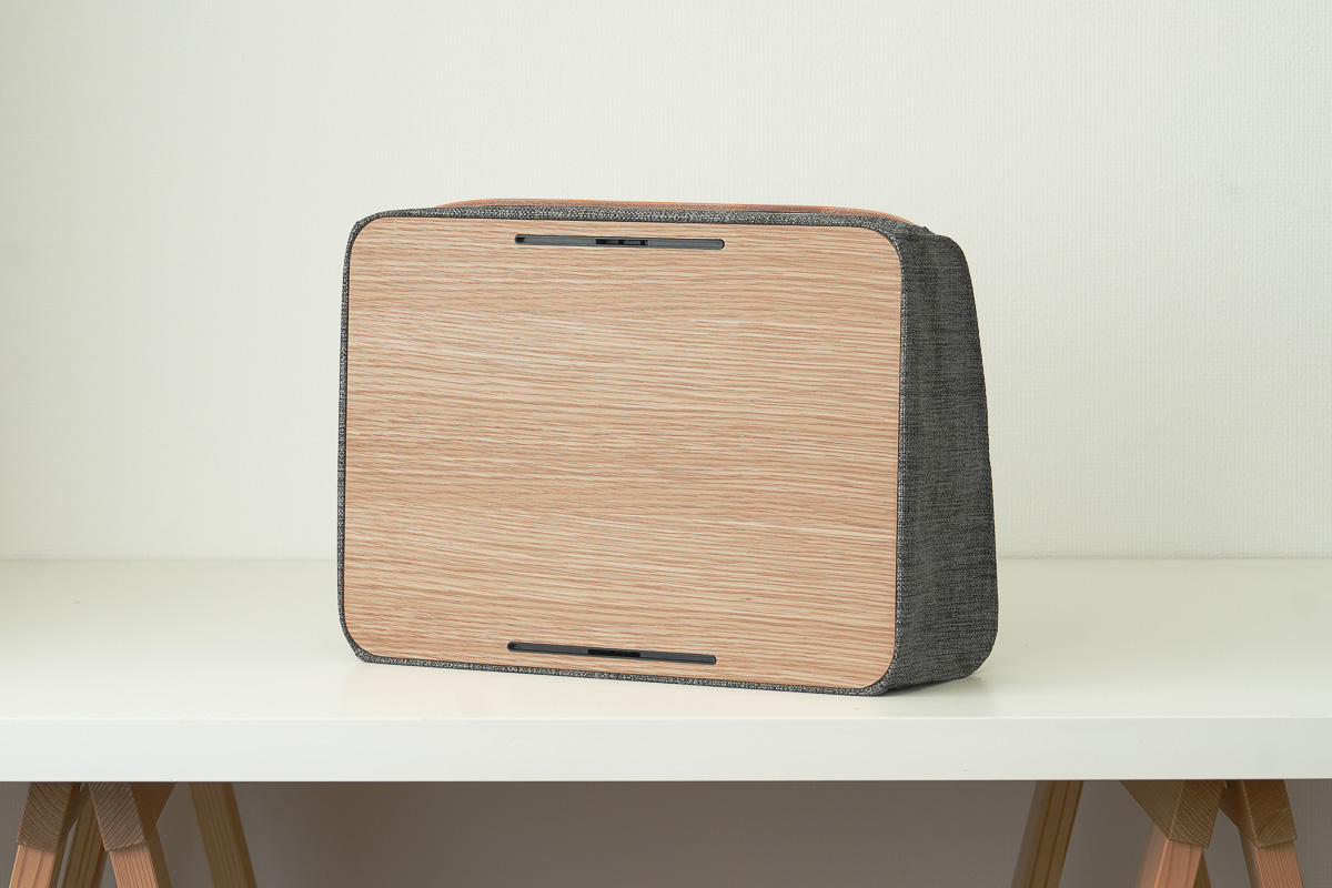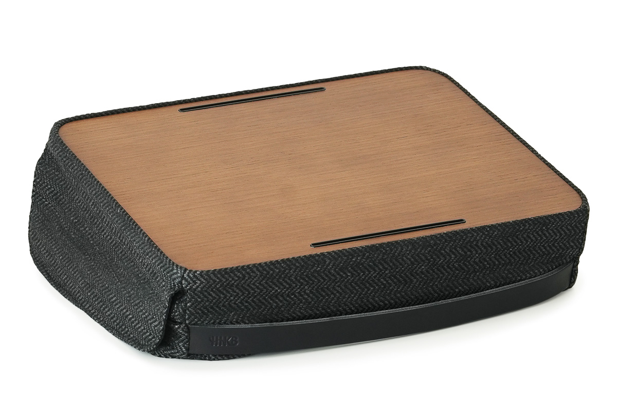一見まくらにも見えるこのデスク、ファブリックに包まれたやわらかなウレタンクッション側を太ももに乗せ、木製の天板の上にノートPCやタブレット、メモ帳などを置いて使います。本体サイズは幅約34×奥行約26×高さ約12cmで、天板には13インチ以下のノートPCやタブレット、またMacBook Pro/Airなどの薄型の14インチPCを置くことが可能。