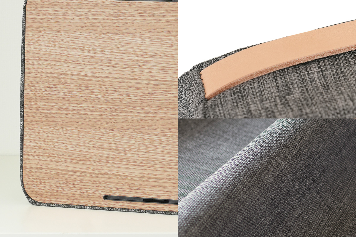 ファブリックには、高い耐久性のある椅子張り用の生地を採用。デスク部分の天板には丈夫なオーク突板が使われており、ペンを使った場合も跡残りがしにくい仕様になっています。