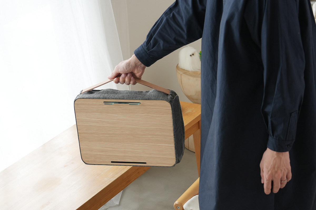 ユニークなのが、このデスクがカバンにもなることで、中にノートPCやキーボード、ACアダプター、モバイルバッテリーなどを収納可能。仕切りもあるので中身を分けてしまうことができます。取っ手には天然のレザーが使われているので、使い込むほどに味わいが増し、愛着もひとしおに。立てて置けば省スペースなので邪魔になることもありません。