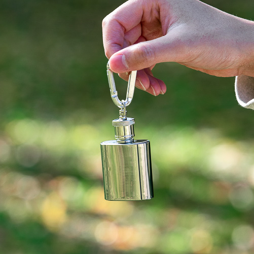 そんなスキットルに改めて注目したのがアウトドアブランドのハイマウント。通常のサイズから大胆にサイズダウンし、よりスタイリッシュに持ち歩ける「スティックフラスコ」(2530円)と、吊り下げて使えるミニサイズの「フラスコキーホルダー」(1980円)を発売しました。