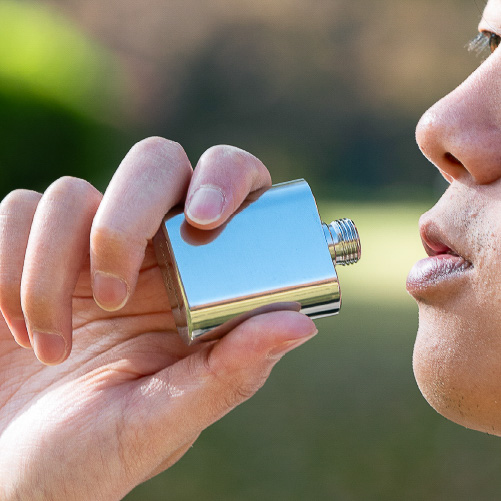 一方の「フラスコキーホルダー」はアクセサリー感覚でお酒が持ち歩けるミニボトルタイプ。容量は約30mLと大さじ約2杯分。アルコールと上手に付き合う、そんな大人の余裕を魅せるスタイルを後押しします。