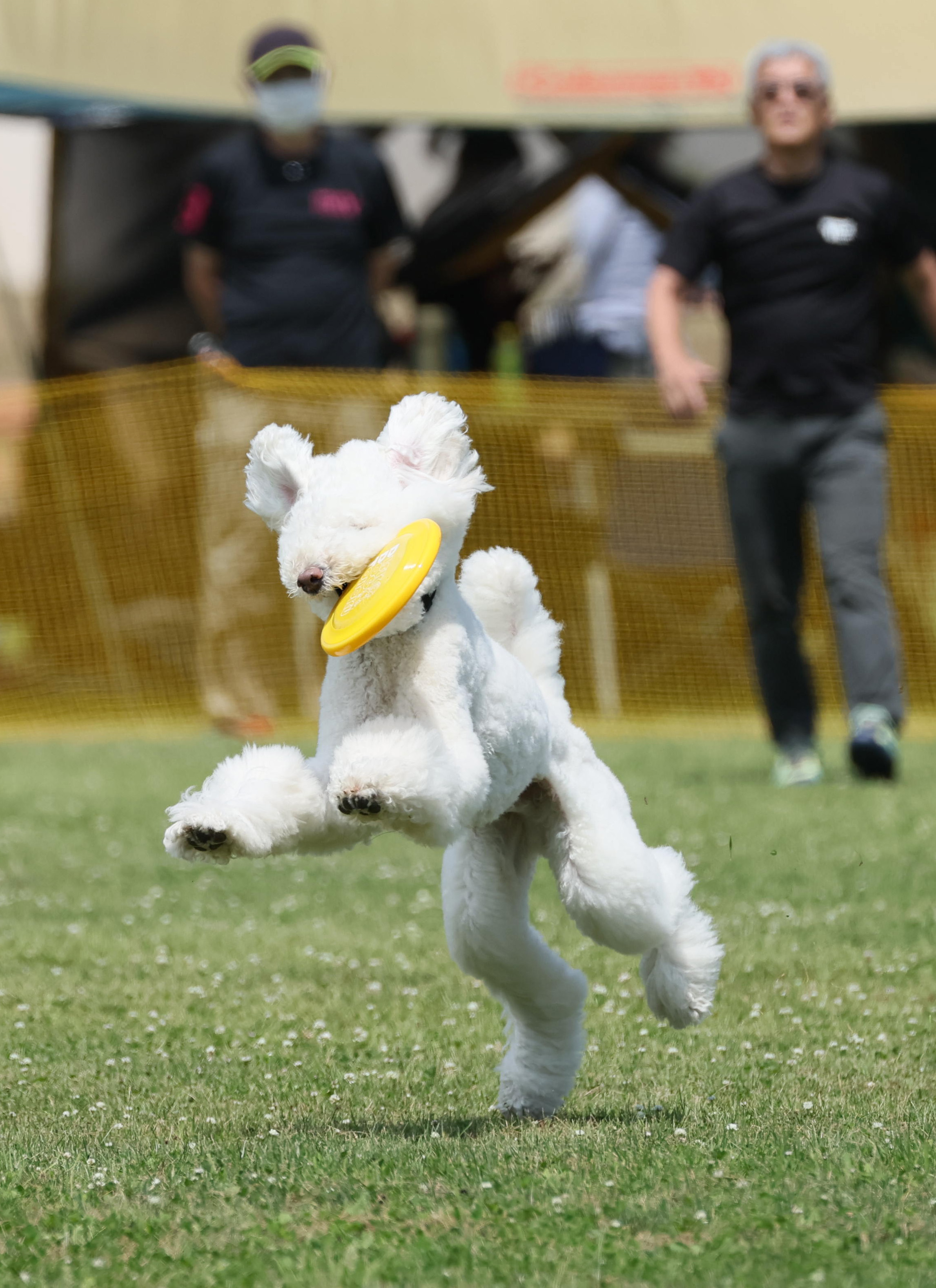 ▲たまねぎさん夫妻は15年以上前、先住犬とともにディスクドッグをはじめ、現在も続けている。「大会にも出場しています。私たちはさっぱり上達せず、愛犬たちに迷惑をかけることも多いのですが、一緒に楽しんでいます」